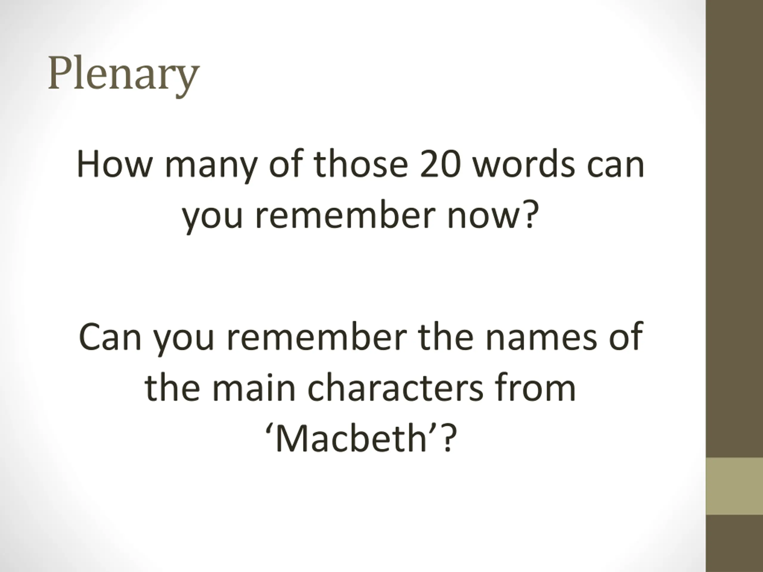 Plenary How many of those 20 words can you remember now? Can you remember the names of the main characters from Macbeth ?