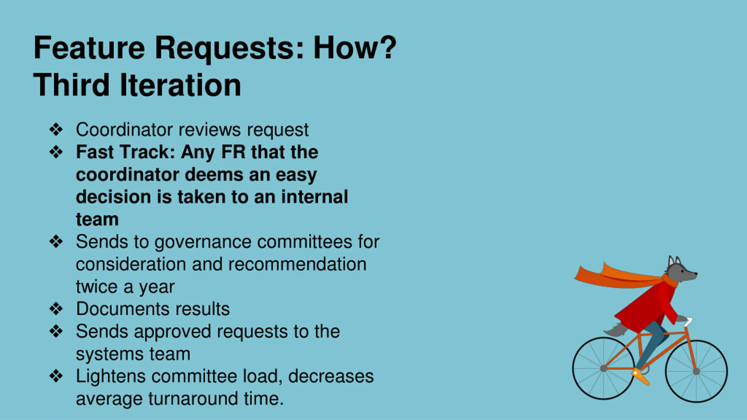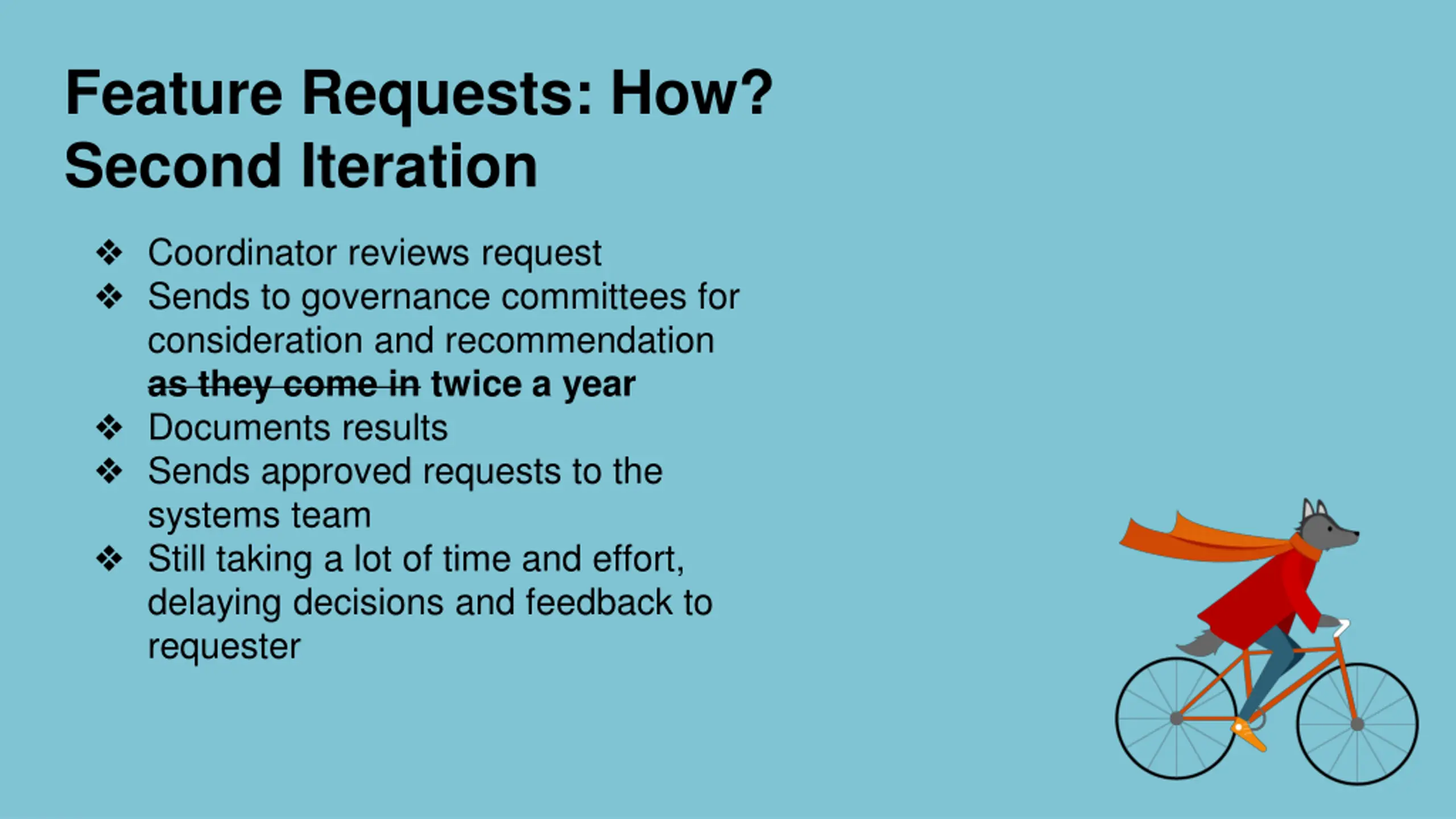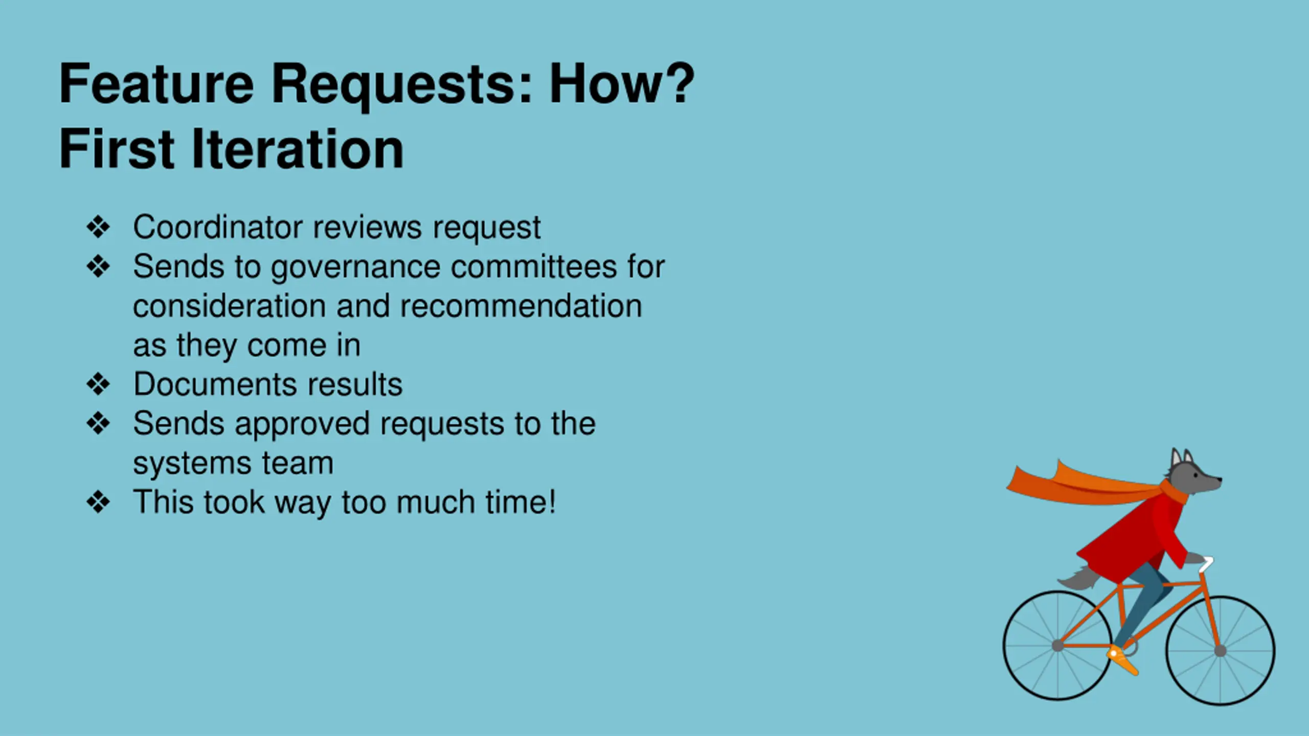 Feature Requests: How? First Iteration Coordinator reviews request Sends to governance committees for consideration and recommendation as they come in Documents results Sends approved requests to the systems team This took way too much time!