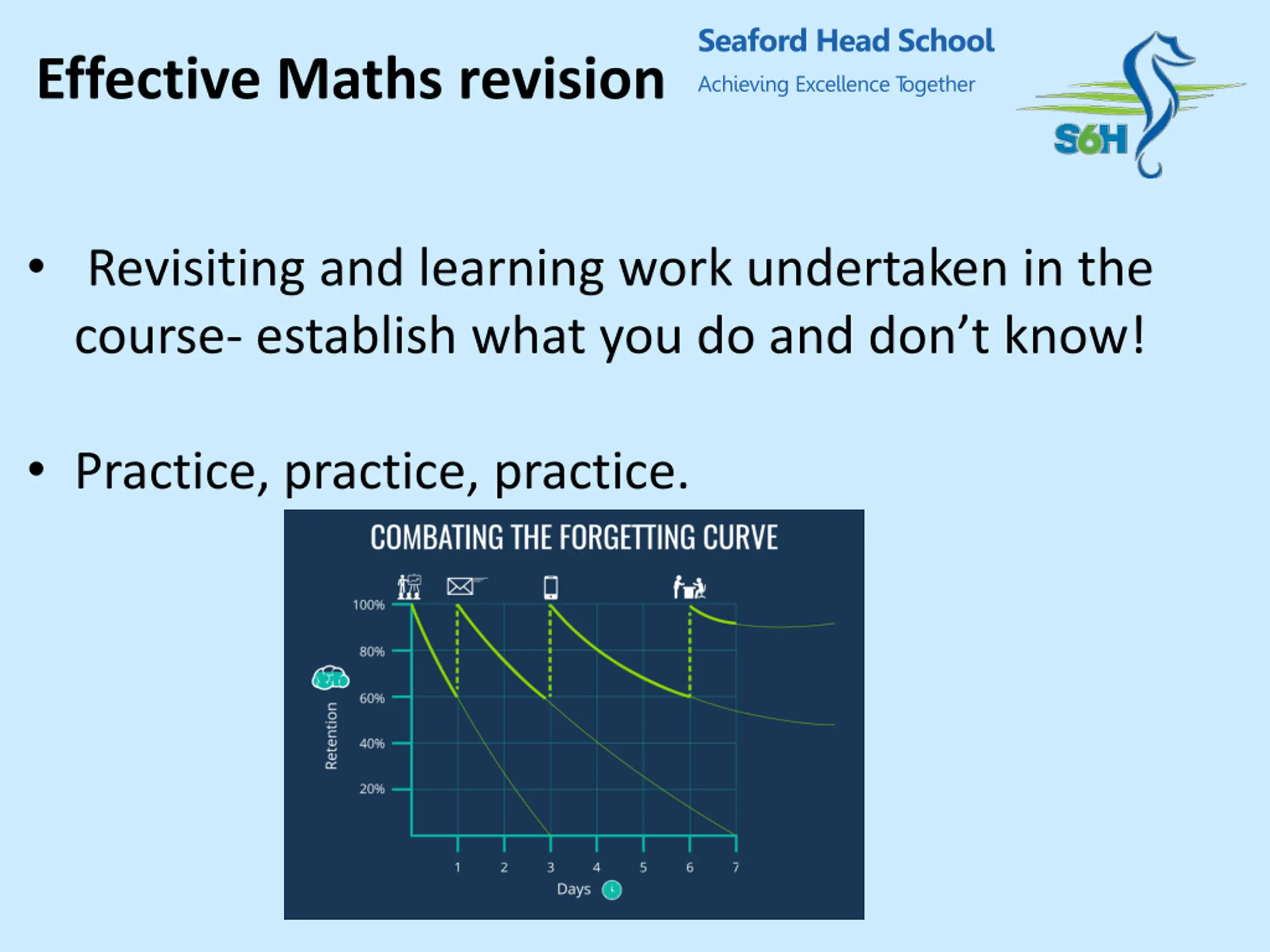 Seaford Head School Effective Maths revision Achieving Excellence T ogether Revisiting and learning work undertaken in the course- establish what you do and don t know! Practice, practice, practice.