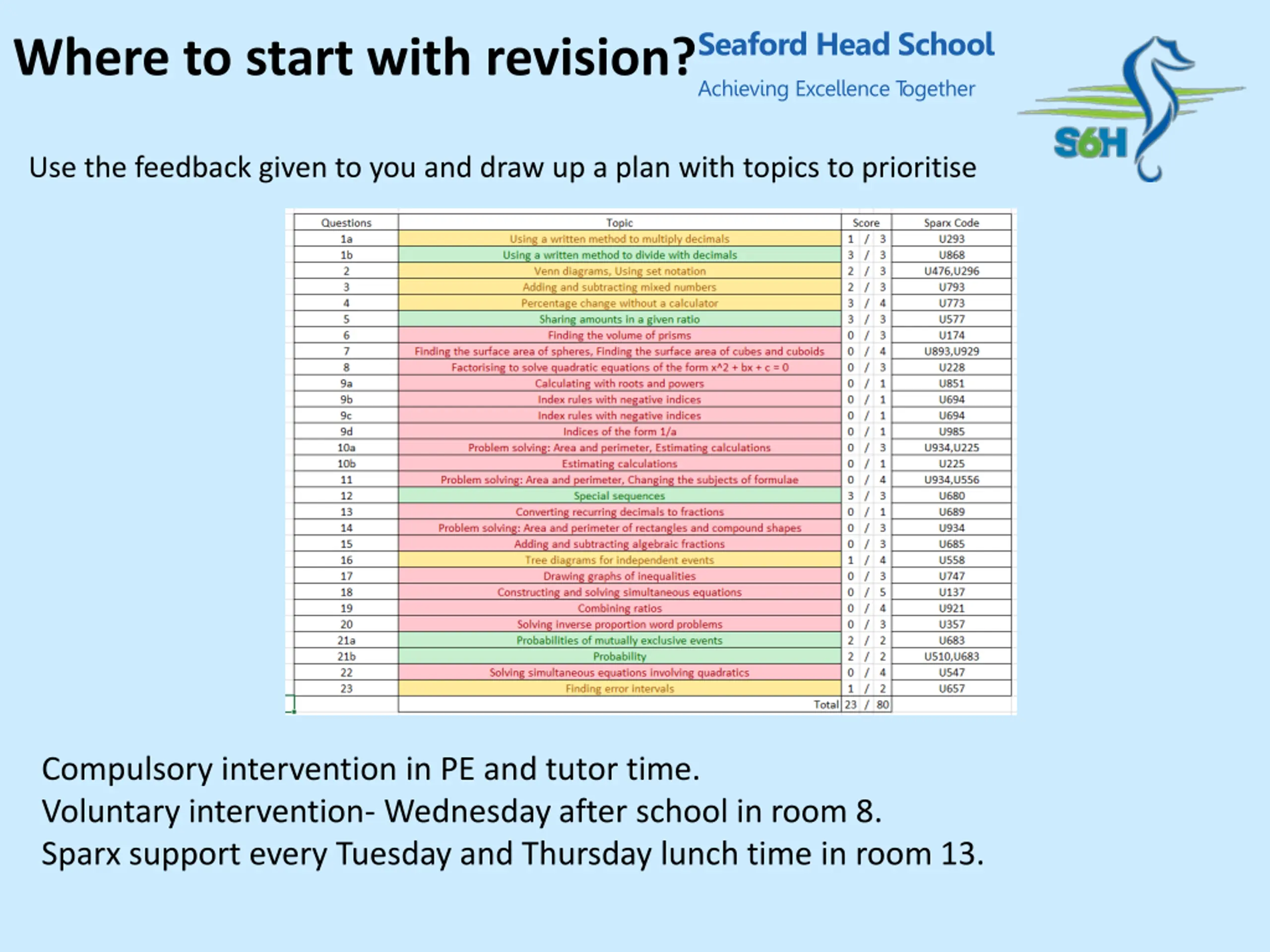 Seaford Head School Where to start with revision? Achieving Excellence T ogether Use the feedback given to you and draw up a plan with topics to prioritise Compulsory intervention in PE and tutor time. Voluntary intervention- Wednesday after school in room 8. Sparx support every Tuesday and Thursday lunch time in room 13.