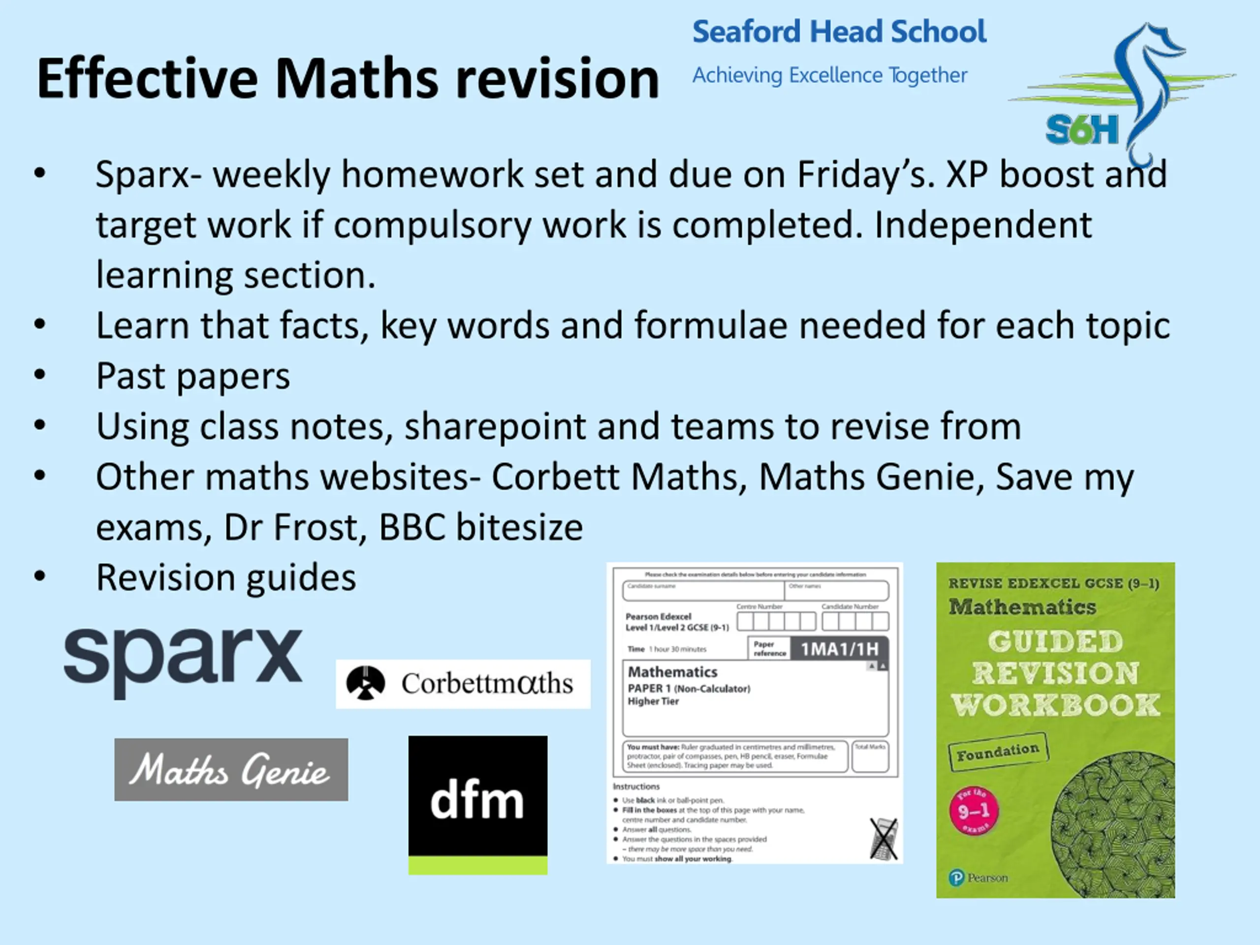 Seaford Head School Effective Maths revision Achieving Excellence T ogether Sparx- weekly homework set and due on Friday s. XP boost and target work if compulsory work is completed. Independent learning section. Learn that facts, key words and formulae needed for each topic Past papers Using class notes, sharepoint and teams to revise from Other maths websites- Corbett Maths, Maths Genie, Save my exams, Dr Frost, BBC bitesize Revision guides