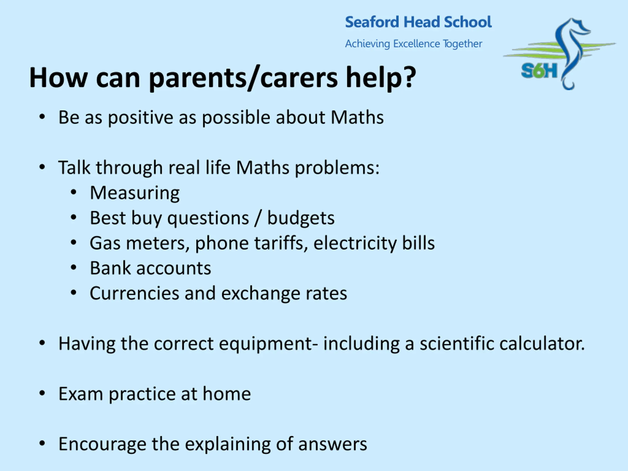 Seaford Head School Achieving Excellence T ogether How can parents/carers help? Be as positive as possible about Maths Talk through real life Maths problems: Measuring Best buy questions / budgets Gas meters, phone tariffs, electricity bills Bank accounts Currencies and exchange rates Having the correct equipment- including a scientific calculator. Exam practice at home Encourage the explaining of answers
