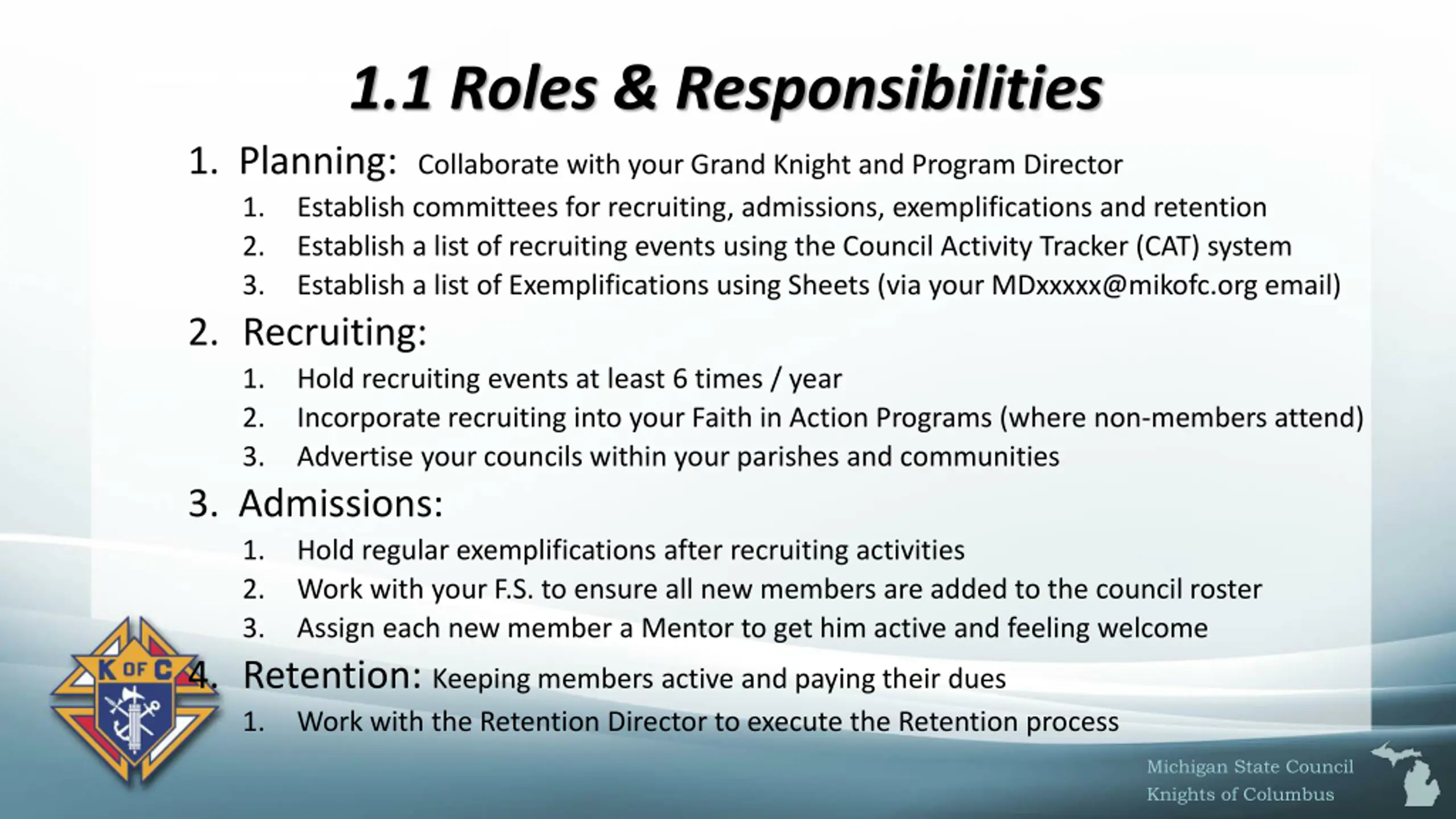 1.1 Roles & Responsibilities 1. Planning: Collaborate with your Grand Knight and Program Director 1. Establish committees for recruiting, admissions, exemplifications and retention 2. Establish a list of recruiting events using the Council Activity Tracker (CAT) system 3. Establish a list of Exemplifications using Sheets (via your MDxxxxx@mikofc.org email) 2. Recruiting: 1. Hold recruiting events at least 6 times / year 2. Incorporate recruiting into your Faith in Action Programs (where non-members attend) 3. Advertise your councils within your parishes and communities 3. Admissions: 1. Hold regular exemplifications after recruiting activities 2. Work with your F.S. to ensure all new members are added to the council roster 3. Assign each new member a Mentor to get him active and feeling welcome 4. Retention: Keeping members active and paying their dues 1. Work with the Retention Director to execute the Retention process Michigan State Council Knights of Columbus