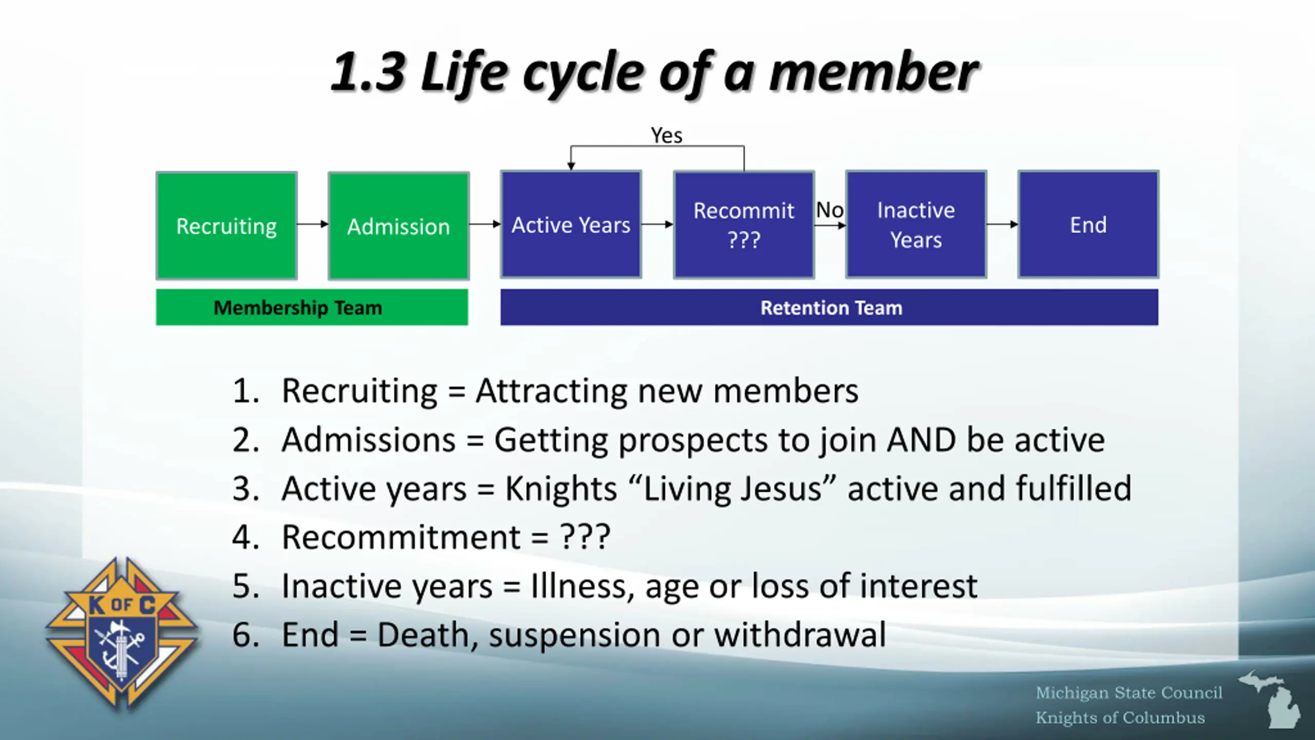 1.3 Life cycle of a member Yes No Inactive Years Recommit ??? Active Years End Recruiting Admission Membership Team Retention Team 1. Recruiting = Attracting new members 2. Admissions = Getting prospects to join AND be active 3. Active years = Knights LivingJesus active and fulfilled 4. Recommitment = ??? 5. Inactive years = Illness, age or loss of interest 6. End = Death, suspension or withdrawal Michigan State Council Knights of Columbus
