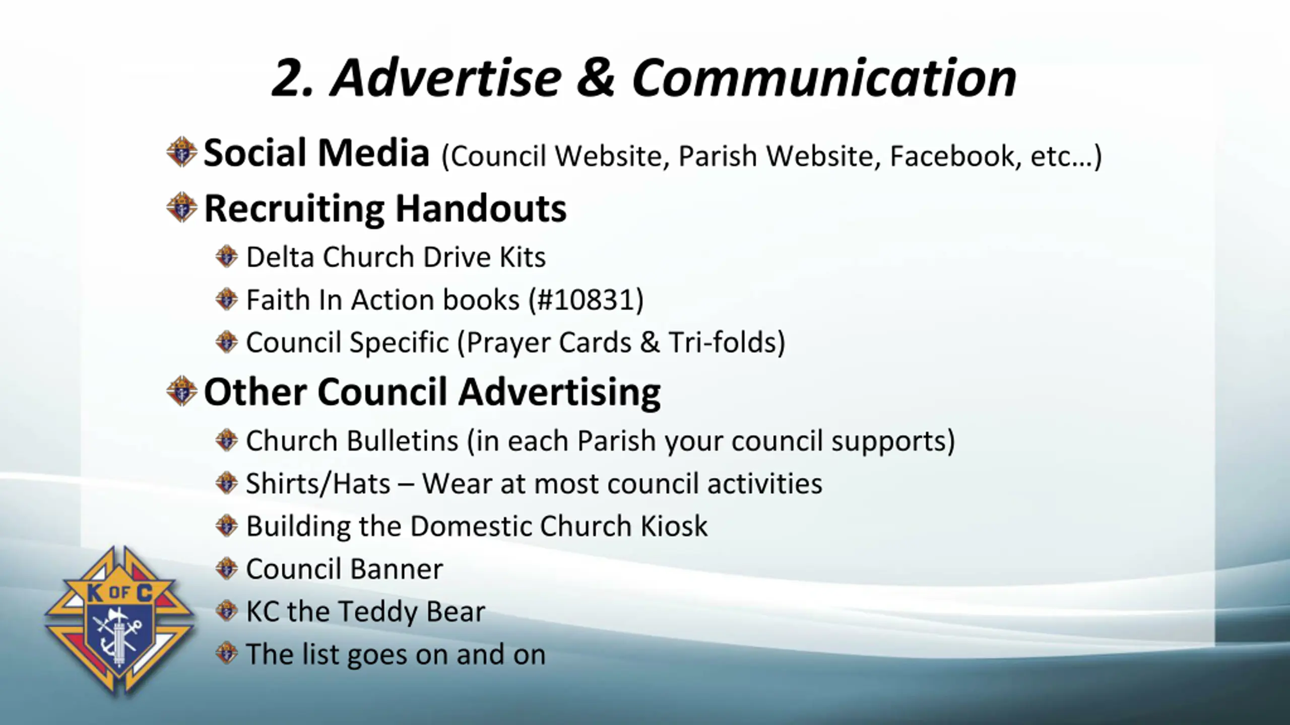 2. Advertise & Communication Social Media (Council Website, Parish Website, Facebook, etc ) Recruiting Handouts Delta Church Drive Kits Faith In Action books (#10831) Council Specific (Prayer Cards & Tri-folds) Other Council Advertising Church Bulletins (in each Parish your council supports) Shirts/Hats Wear at most council activities Building the Domestic Church Kiosk Council Banner KC the Teddy Bear The list goes on and on