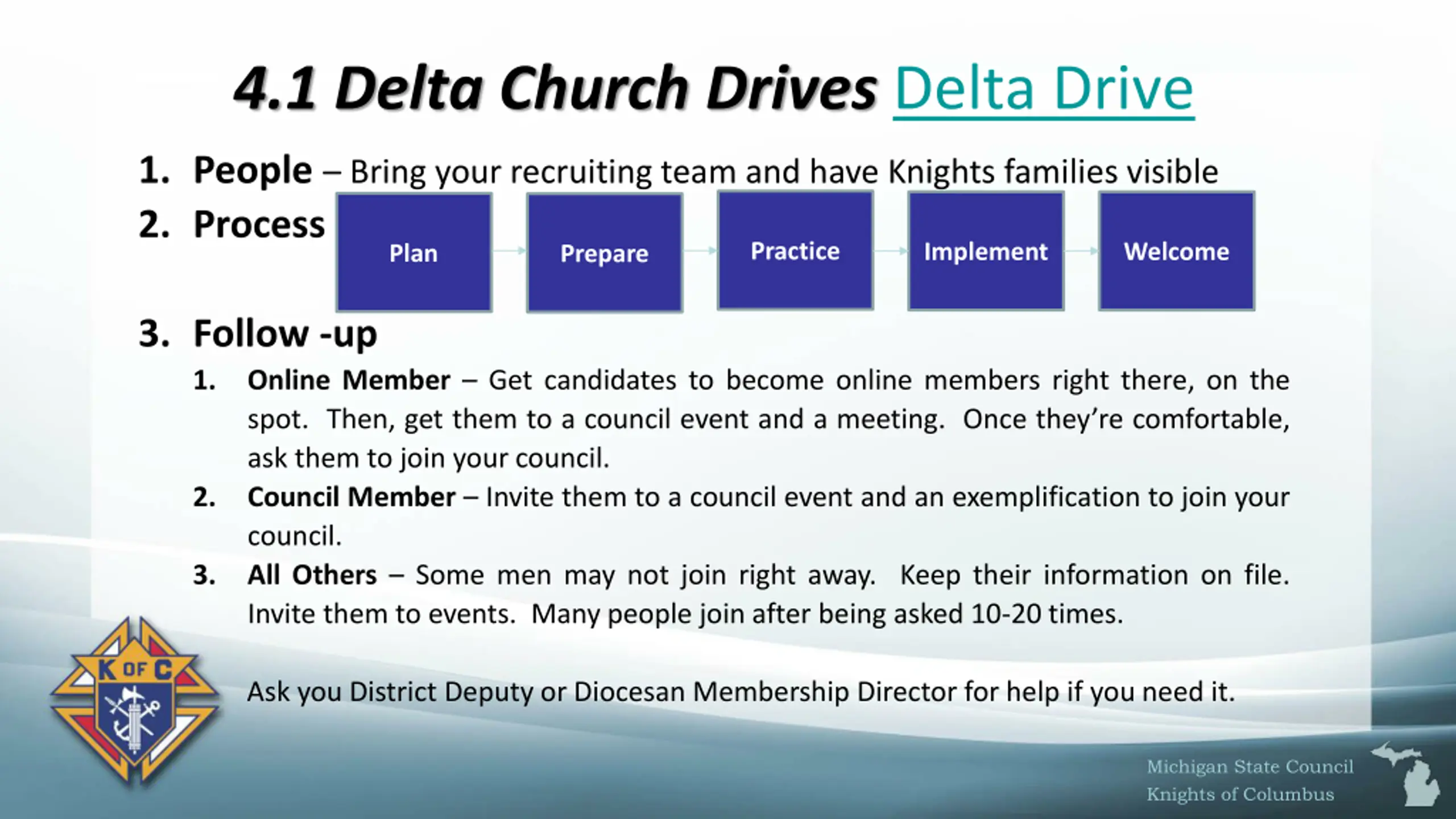 4.1 Delta Church Drives Delta Drive 1. People Bring your recruiting team and have Knights families visible 2. Process Plan Prepare Practice Implement Welcome 3. Follow -up 1. Online Member Get candidates to become online members right there, on the spot. Then, get them to a council event and a meeting. Once they re comfortable, ask them to join your council. 2. Council Member Invite them to a council event and an exemplification to join your council. 3. All Others Some men may not join right away. Keep their information on file. Invite them to events. Many people join after being asked 10-20 times. Ask you District Deputy or Diocesan Membership Director for help if you need it. Michigan State Council Knights of Columbus