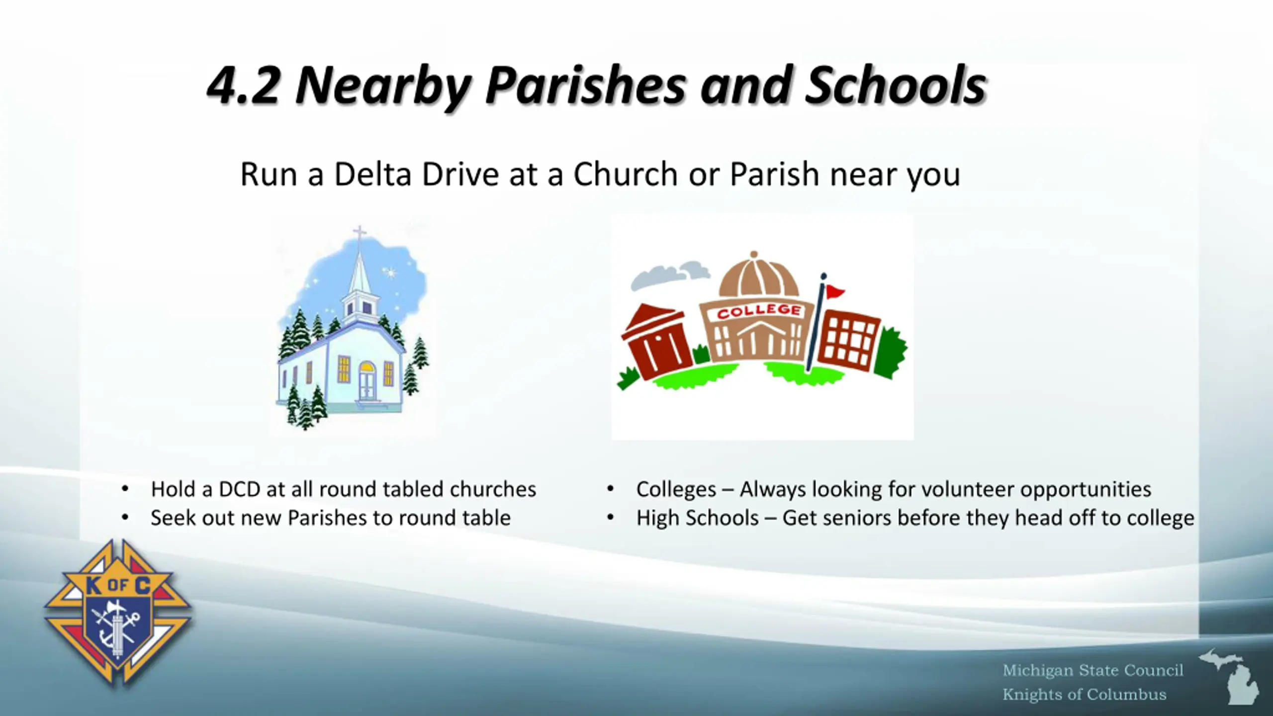 4.2 Nearby Parishes and Schools Run a Delta Drive at a Church or Parish near you Hold a DCD at all round tabled churches Seek out new Parishes to round table Colleges Always looking for volunteer opportunities High Schools Get seniors before they head off to college Michigan State Council Knights of Columbus