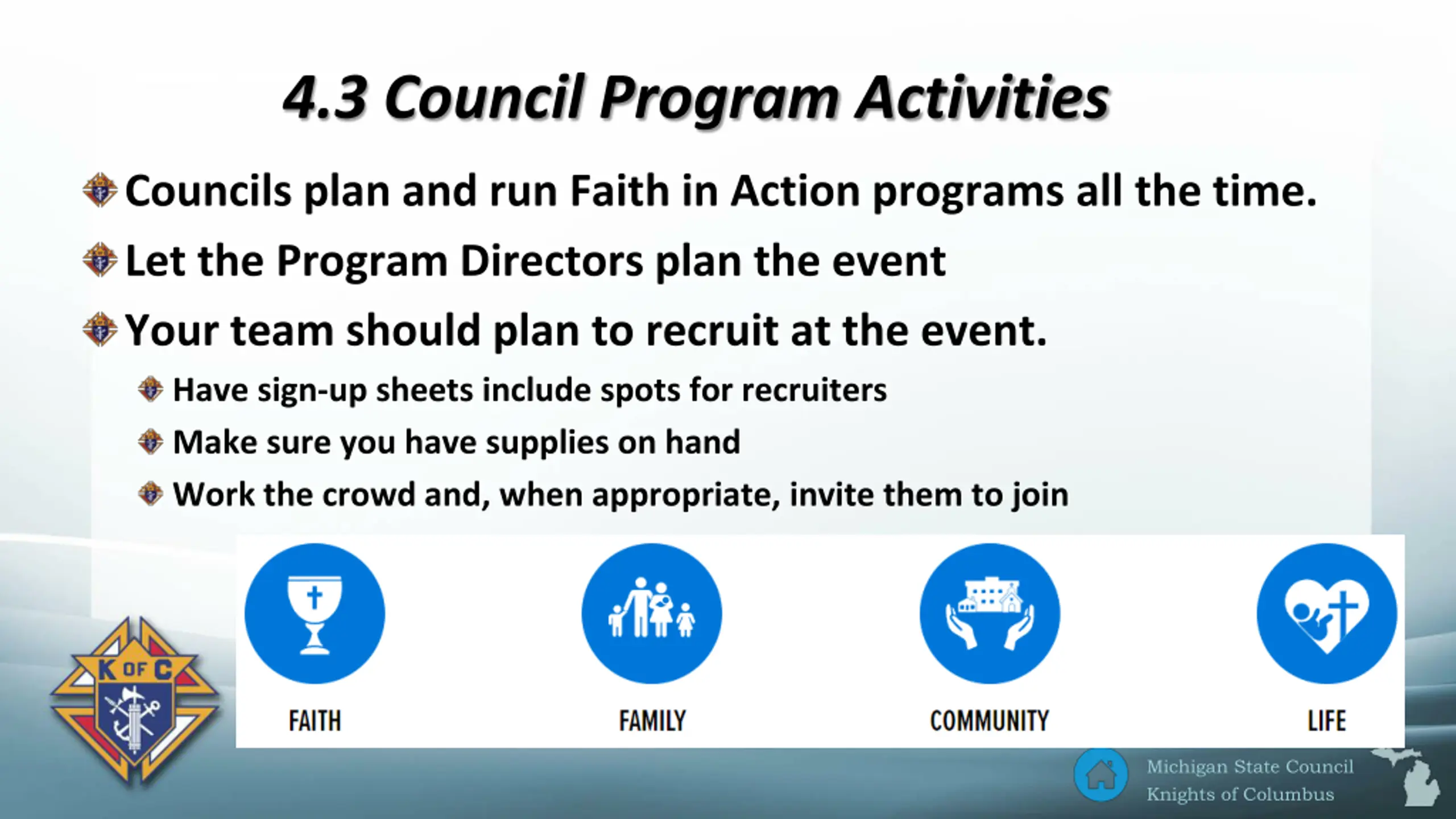 4.3 Council Program Activities Councils plan and run Faith in Action programs all the time. Let the Program Directors plan the event Your team should plan to recruit at the event. Have sign-up sheets include spots for recruiters Make sure you have supplies on hand Work the crowd and, when appropriate, invite them to join Michigan State Council Knights of Columbus