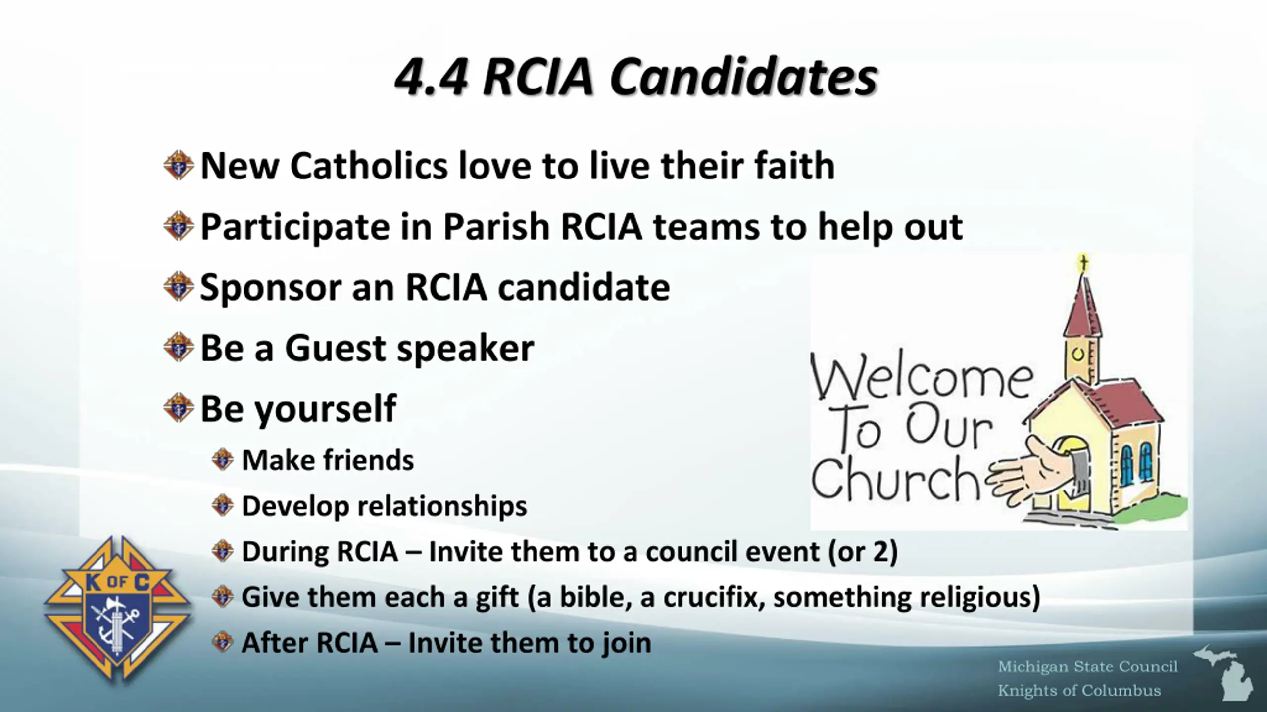 4.4 RCIA Candidates New Catholics love to live their faith Participate in Parish RCIA teams to help out Sponsor an RCIA candidate Be a Guest speaker Be yourself Make friends Develop relationships During RCIA Invite them to a council event (or 2) Give them each a gift (a bible, a crucifix, something religious) After RCIA Invite them to join Michigan State Council Knights of Columbus