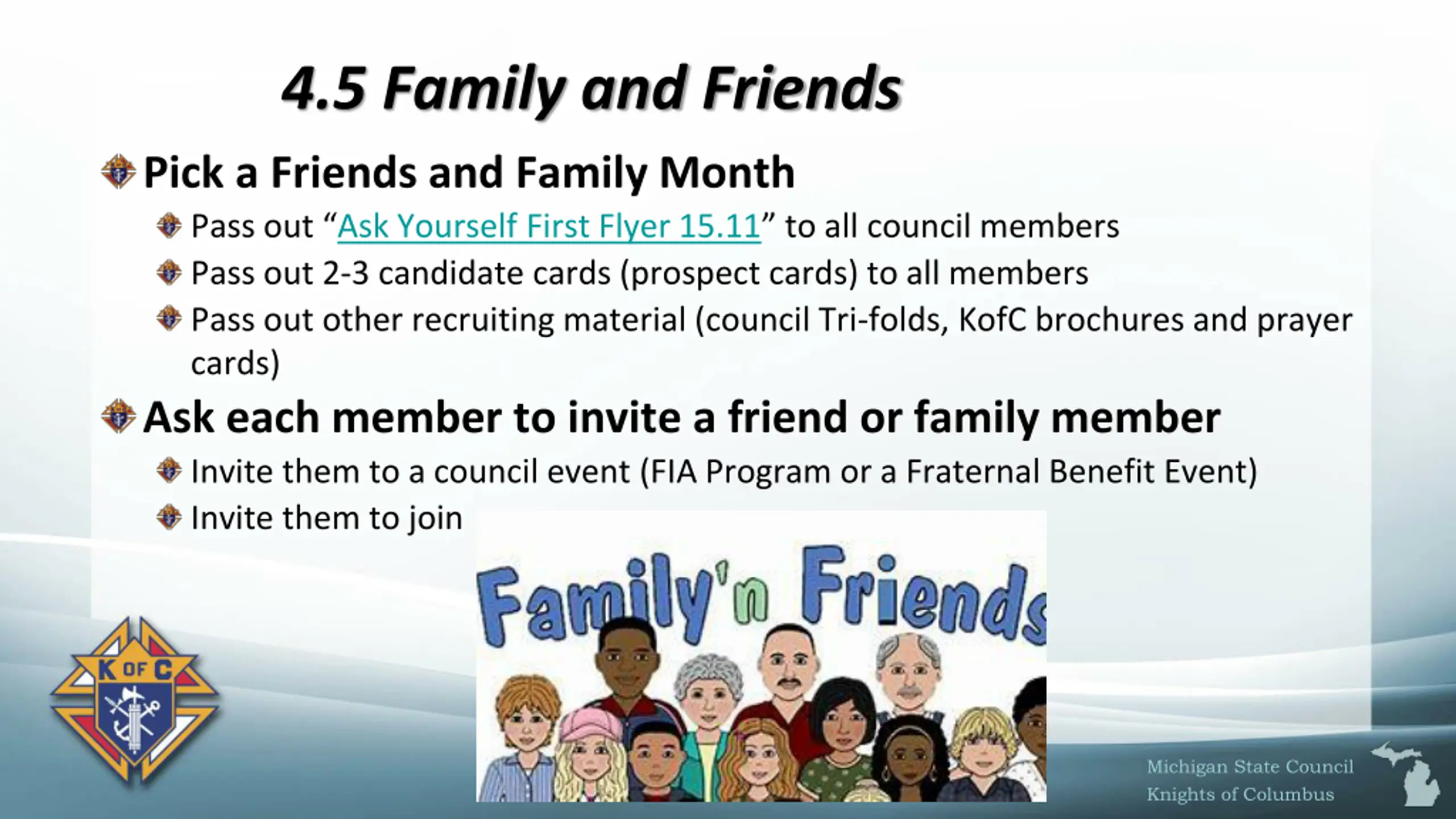 4.5 Family and Friends Pick a Friends and Family Month Pass out Ask Yourself First Flyer 15.11 to all council members Pass out 2-3 candidate cards (prospect cards) to all members Pass out other recruiting material (council Tri-folds, KofC brochures and prayer cards) Ask each member to invite a friend or family member Invite them to a council event (FIA Program or a Fraternal Benefit Event) Invite them to join Michigan State Council Knights of Columbus