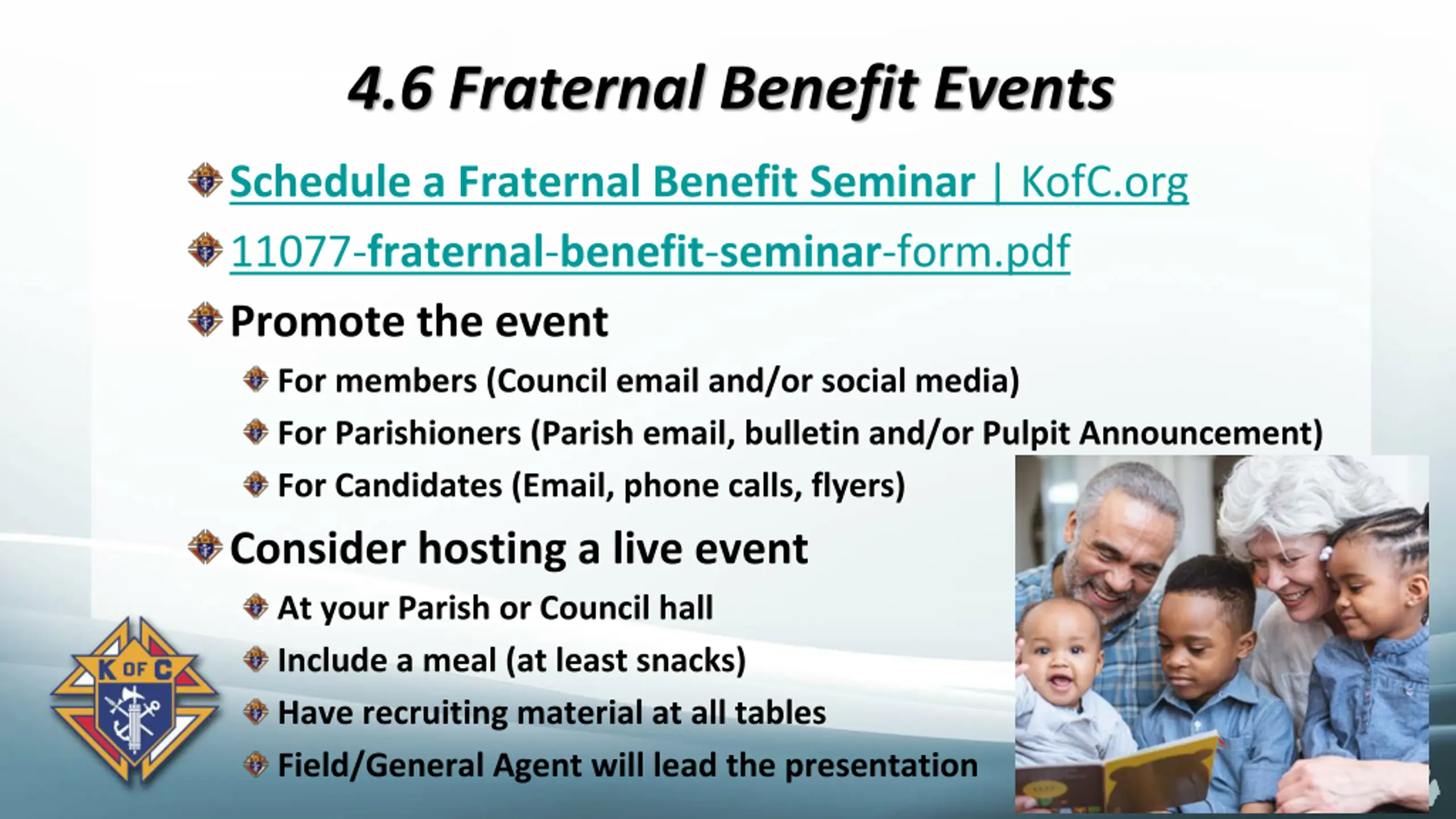 4.6 Fraternal Benefit Events Schedule a Fraternal Benefit Seminar | KofC.org 11077-fraternal-benefit-seminar-form.pdf Promote the event For members (Council email and/or social media) For Parishioners (Parish email, bulletin and/or Pulpit Announcement) For Candidates (Email, phone calls, flyers) Consider hosting a live event At your Parish or Council hall Include a meal (at least snacks) Have recruiting material at all tables Field/General Agent will lead the presentation Michigan State Council Knights of Columbus