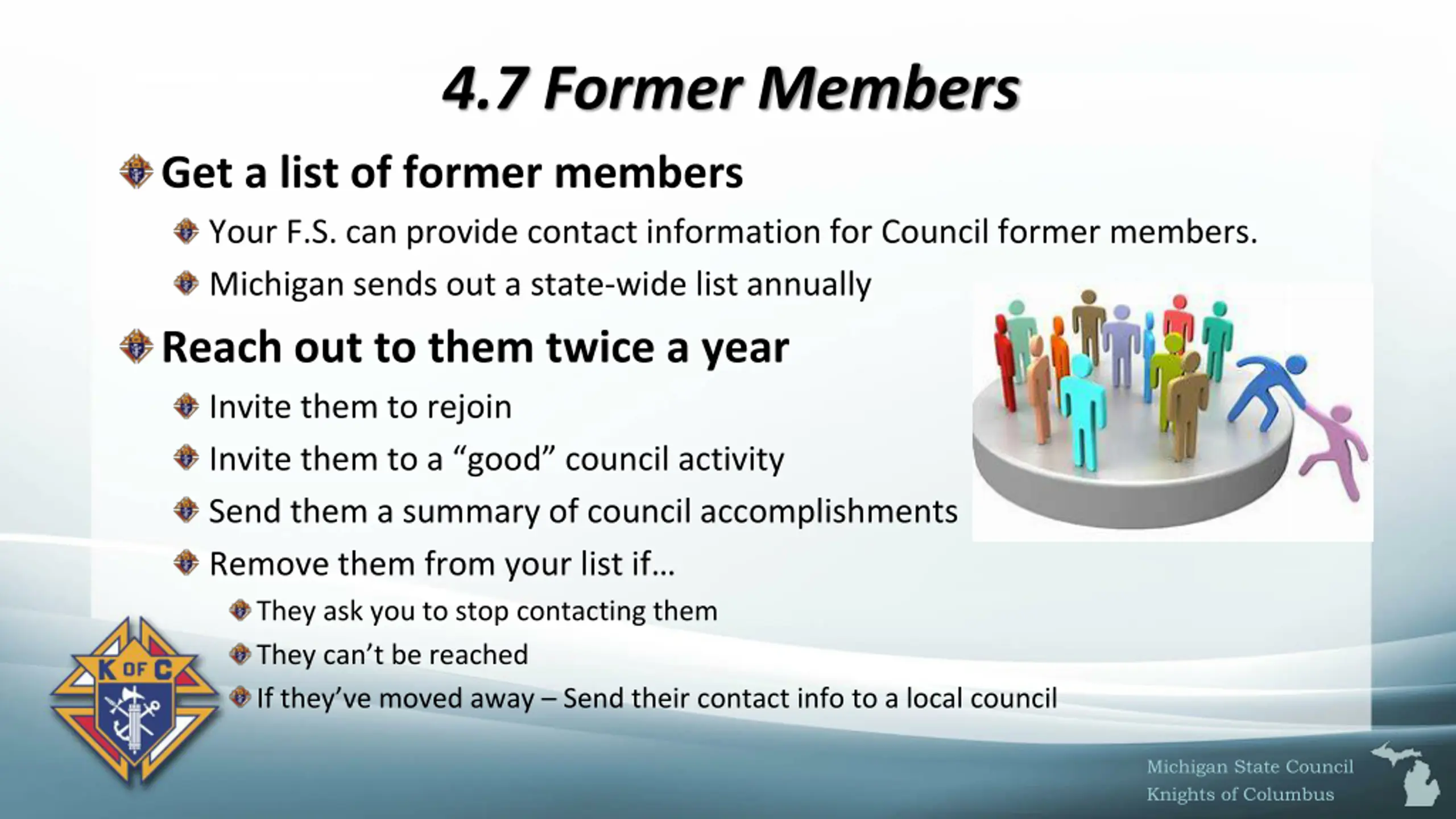 4.7 Former Members Get a list of former members Your F.S. can provide contact information for Council former members. Michigan sends out a state-wide list annually Reach out to them twice a year Invite them to rejoin Invite them to a good council activity Send them a summary of council accomplishments Remove them from your list if They ask you to stop contacting them They can t be reached If they ve moved away Send their contact info to a local council Michigan State Council Knights of Columbus