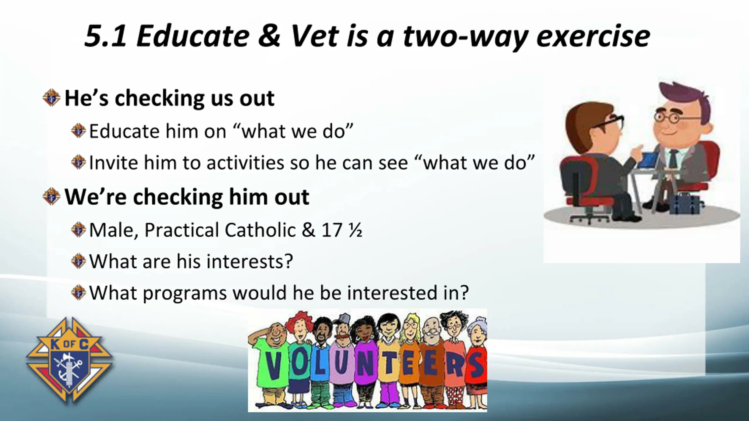 5.1 Educate & Vet is a two-way exercise He s checking us out Educate him on what we do Invite him to activities so he can see what we do We re checking him out Male, Practical Catholic & 17 What are his interests? What programs would he be interested in?