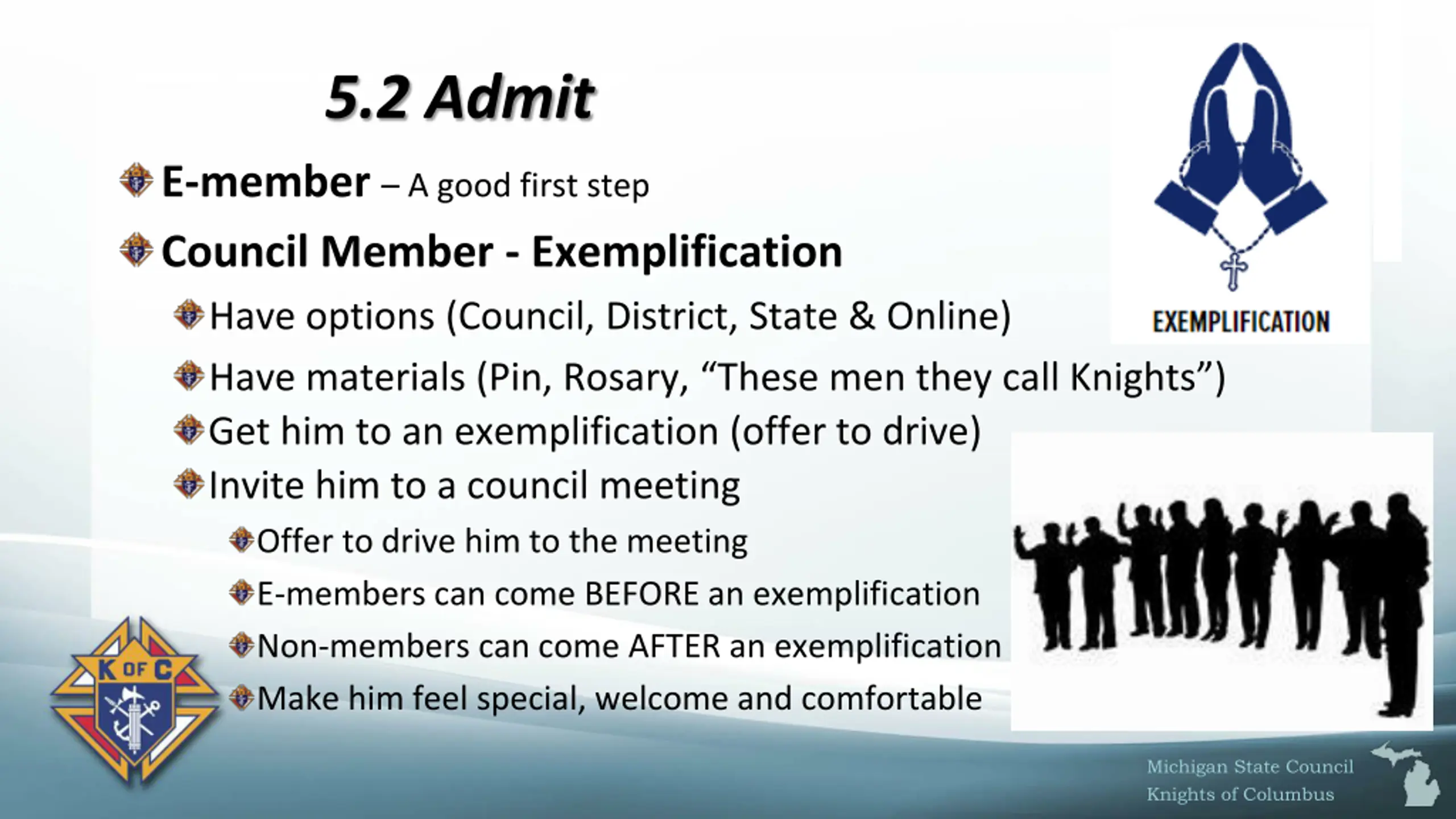 5.2 Admit E-member A good first step Council Member - Exemplification Have options (Council, District, State & Online) Have materials (Pin, Rosary, These men they call Knights ) Get him to an exemplification (offer to drive) Invite him to a council meeting Offer to drive him to the meeting E-members can come BEFORE an exemplification Non-members can come AFTER an exemplification Make him feel special, welcome and comfortable Michigan State Council Knights of Columbus