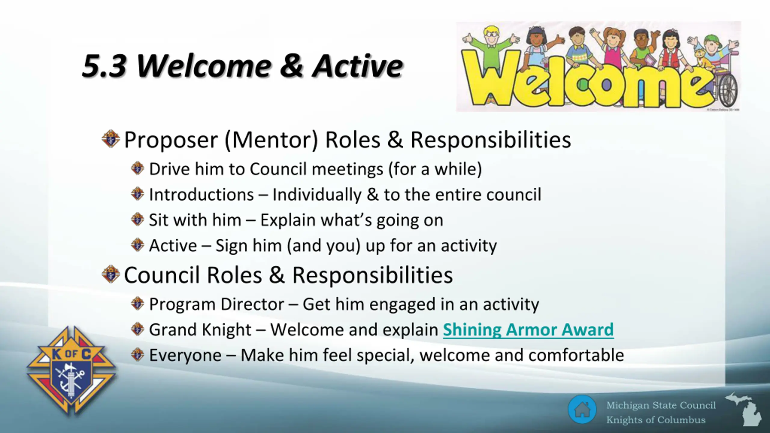 5.3 Welcome & Active Proposer (Mentor) Roles & Responsibilities Drive him to Council meetings (for a while) Introductions Individually & to the entire council Sit with him Explain what s going on Active Sign him (and you) up for an activity Council Roles & Responsibilities Program Director Get him engaged in an activity Grand Knight Welcome and explain Shining Armor Award Everyone Make him feel special, welcome and comfortable Michigan State Council Knights of Columbus
