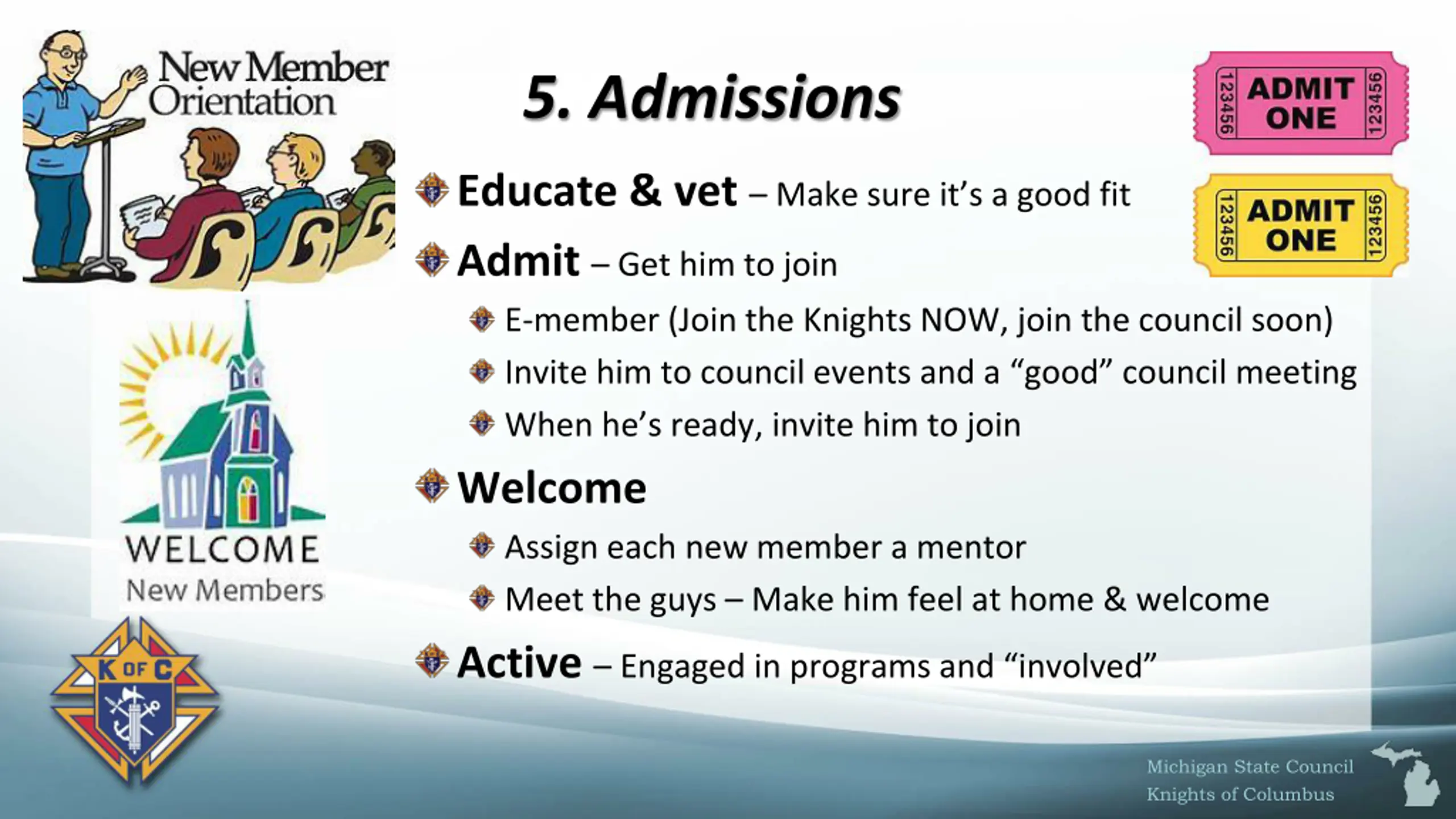 Membership Director Training 2022-2023 1. Overview Membership in the Knights of Columbus 2. Planning Essential for council growth 3. Advertising Attracting new members 4. Recruiting Inviting new members 5. Admissions Initiating new members 6. Retention Keeping members active 7. Best Practices Checklist Michigan State Council Knights of Columbus