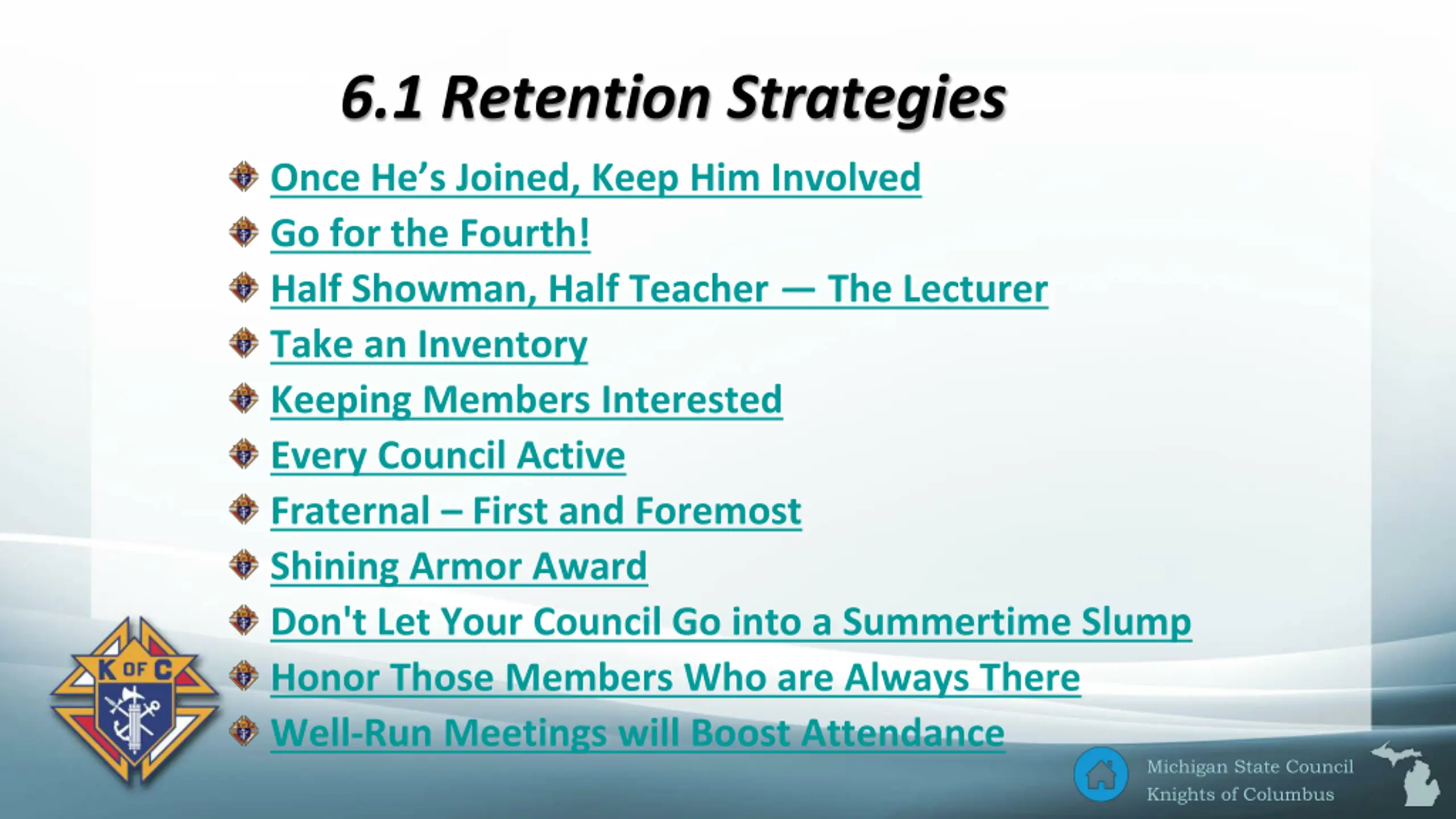 6.1 Retention Strategies Once He s Joined, Keep Him Involved Go for the Fourth! Half Showman, Half Teacher The Lecturer Take an Inventory Keeping Members Interested Every Council Active Fraternal First and Foremost Shining Armor Award Don't Let Your Council Go into a Summertime Slump Honor Those Members Who are Always There Well-Run Meetings will Boost Attendance Michigan State Council Knights of Columbus