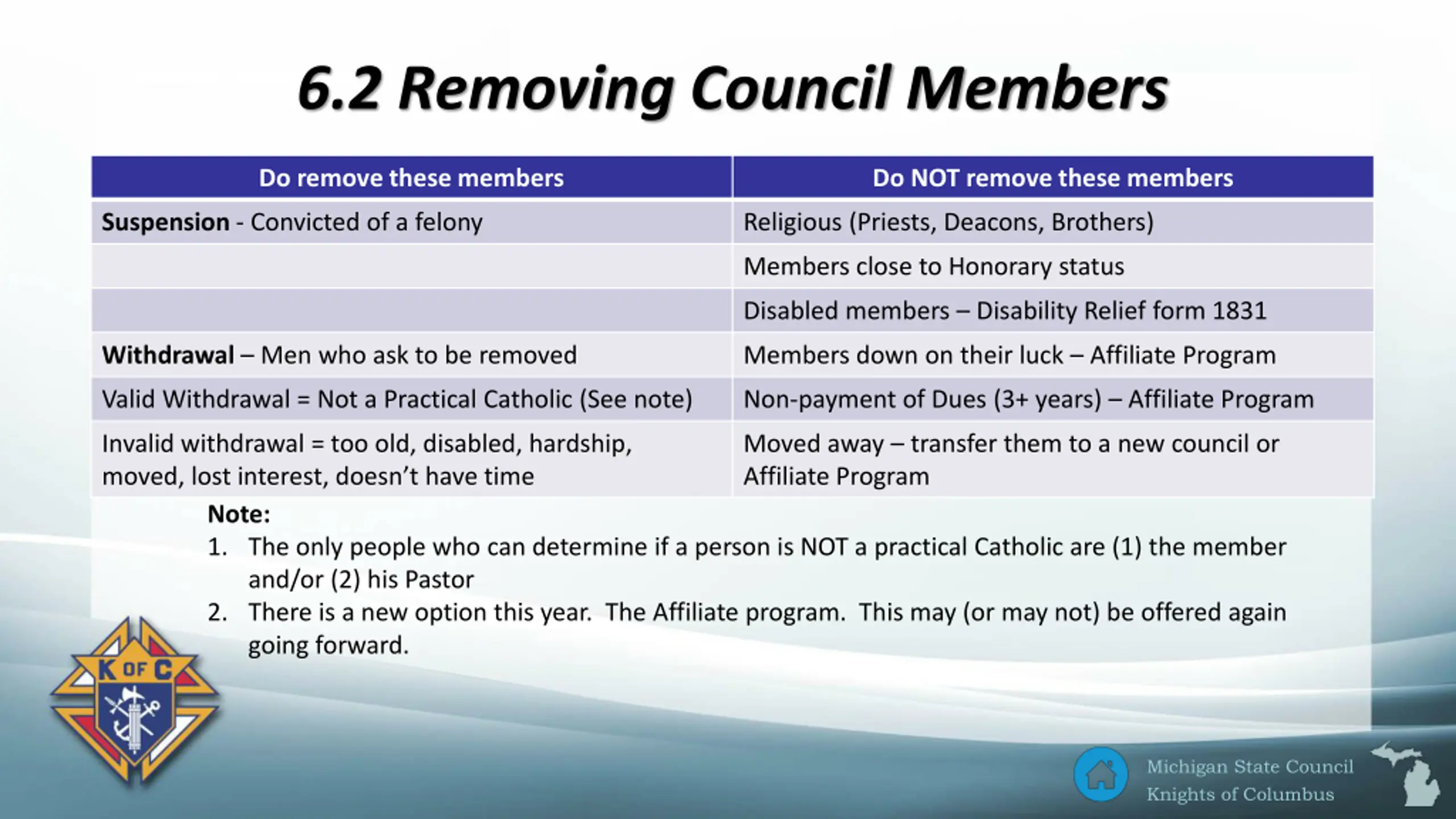 6.2 Removing Council Members Do remove these members Do NOT remove these members Suspension - Convicted of a felony Religious (Priests, Deacons, Brothers) Members close to Honorary status Disabled members Disability Relief form 1831 Withdrawal Men who ask to be removed Members down on their luck Affiliate Program Valid Withdrawal = Not a Practical Catholic (See note) Non-payment of Dues (3+ years) Affiliate Program Invalid withdrawal = too old, disabled, hardship, moved, lost interest, doesn t have time Note: 1. The only people who can determine if a person is NOT a practical Catholic are (1) the member and/or (2) his Pastor 2. There is a new option this year. The Affiliate program. This may (or may not) be offered again going forward. Moved away transfer them to a new council or Affiliate Program Michigan State Council Knights of Columbus
