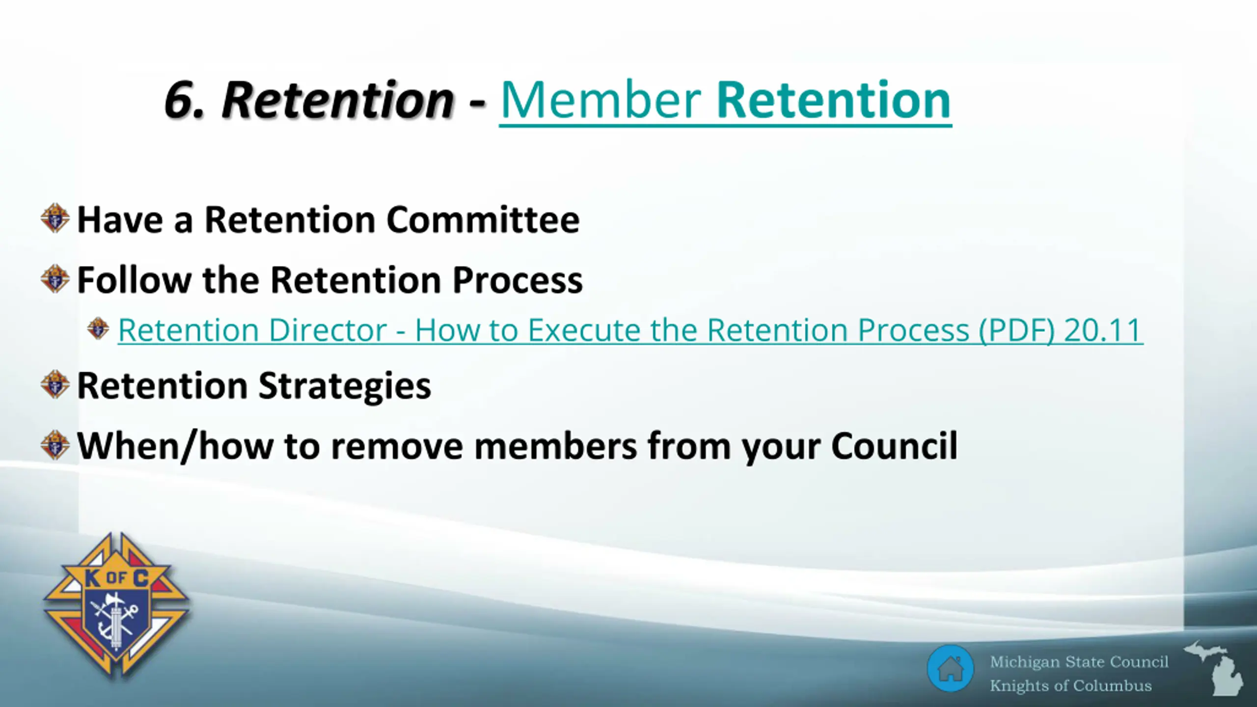 6. Retention - Member Retention Have a Retention Committee Follow the Retention Process Retention Director - How to Execute the Retention Process (PDF) 20.11 Retention Strategies When/how to remove members from your Council Michigan State Council Knights of Columbus