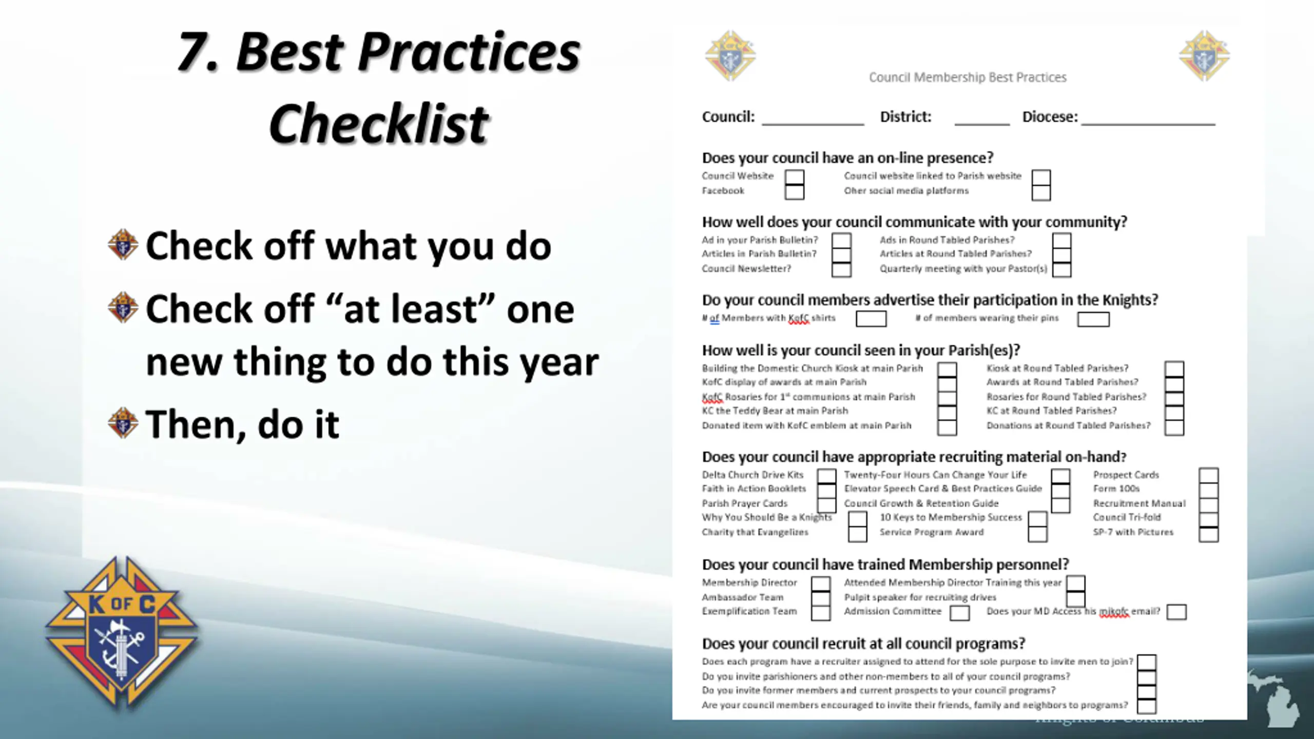 7. Best Practices Checklist Check off what you do Check off at least one new thing to do this year Then, do it Michigan State Council Knights of Columbus