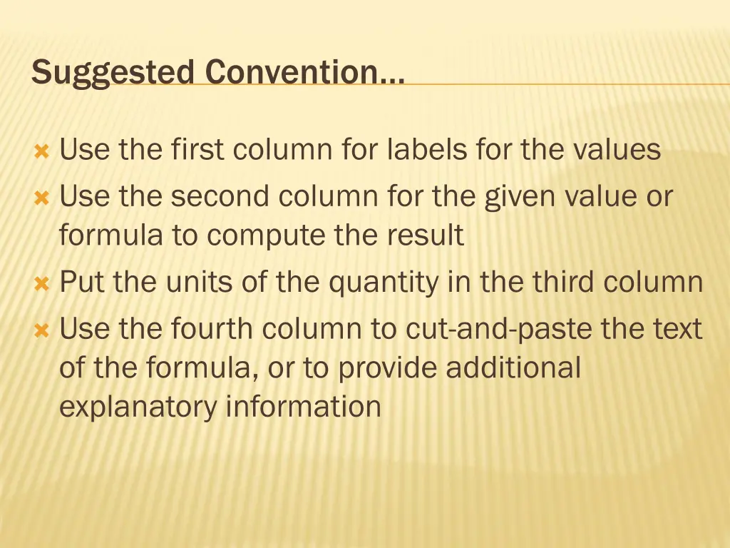 Suggested Convention Use the first column for labels for the values Use the second column for the given value or formula to compute the result Put the units of the quantity in the third column Use the fourth column to cut-and-paste the text of the formula, or to provide additional explanatory information
