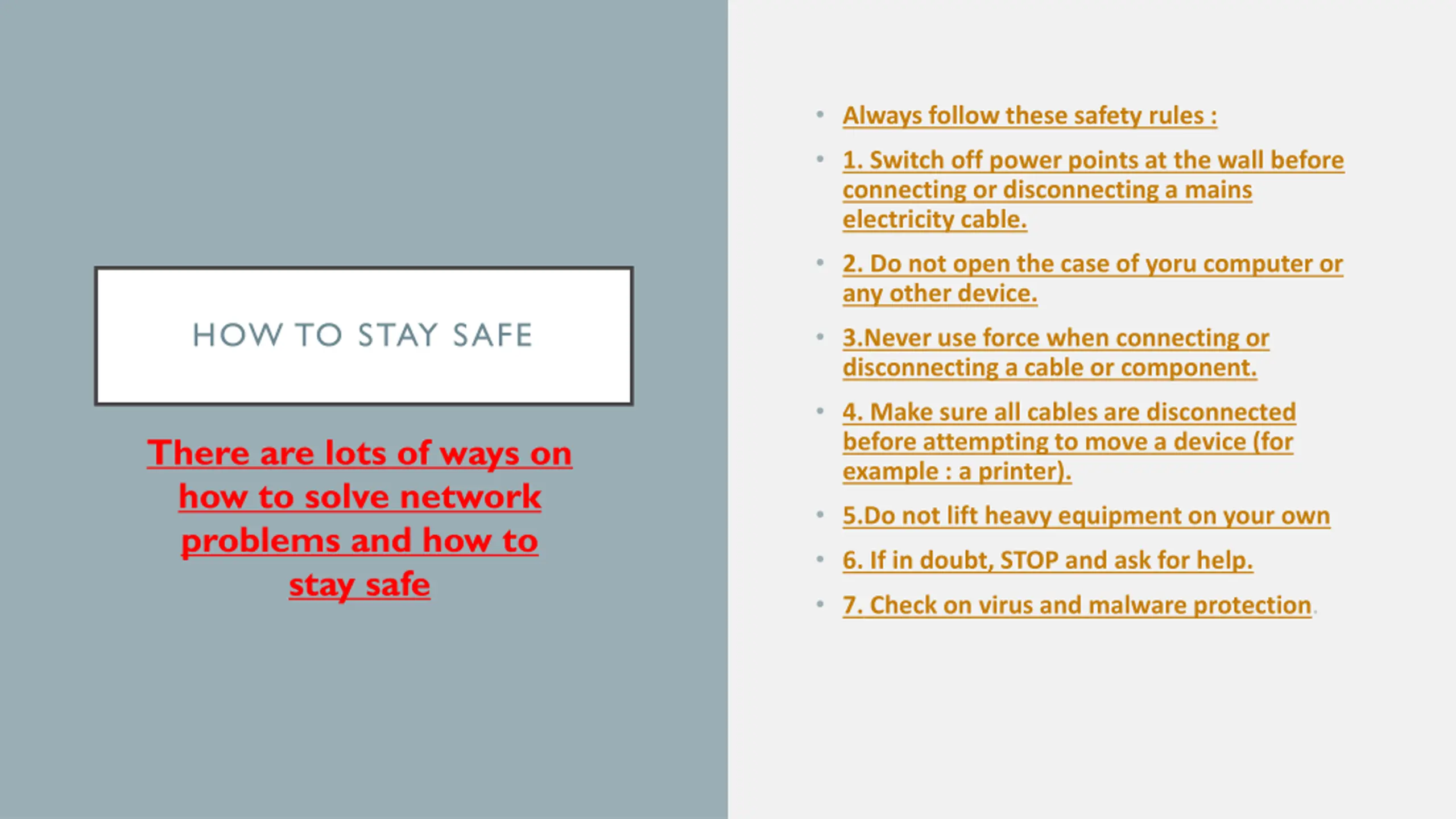 Always follow these safety rules : 1. Switch off power points at the wall before connecting or disconnecting a mains electricity cable. 2. Do not open the case of yoru computer or any other device. 3.Never use force when connecting or disconnecting a cable or component. 4. Make sure all cables are disconnected before attempting to move a device (for example : a printer). 5.Do not lift heavy equipment on your own 6. If in doubt, STOP and ask for help. 7. Check on virus and malware protection. HOW TO STAY SAFE There are lots of ways on how to solve network problems and how to stay safe