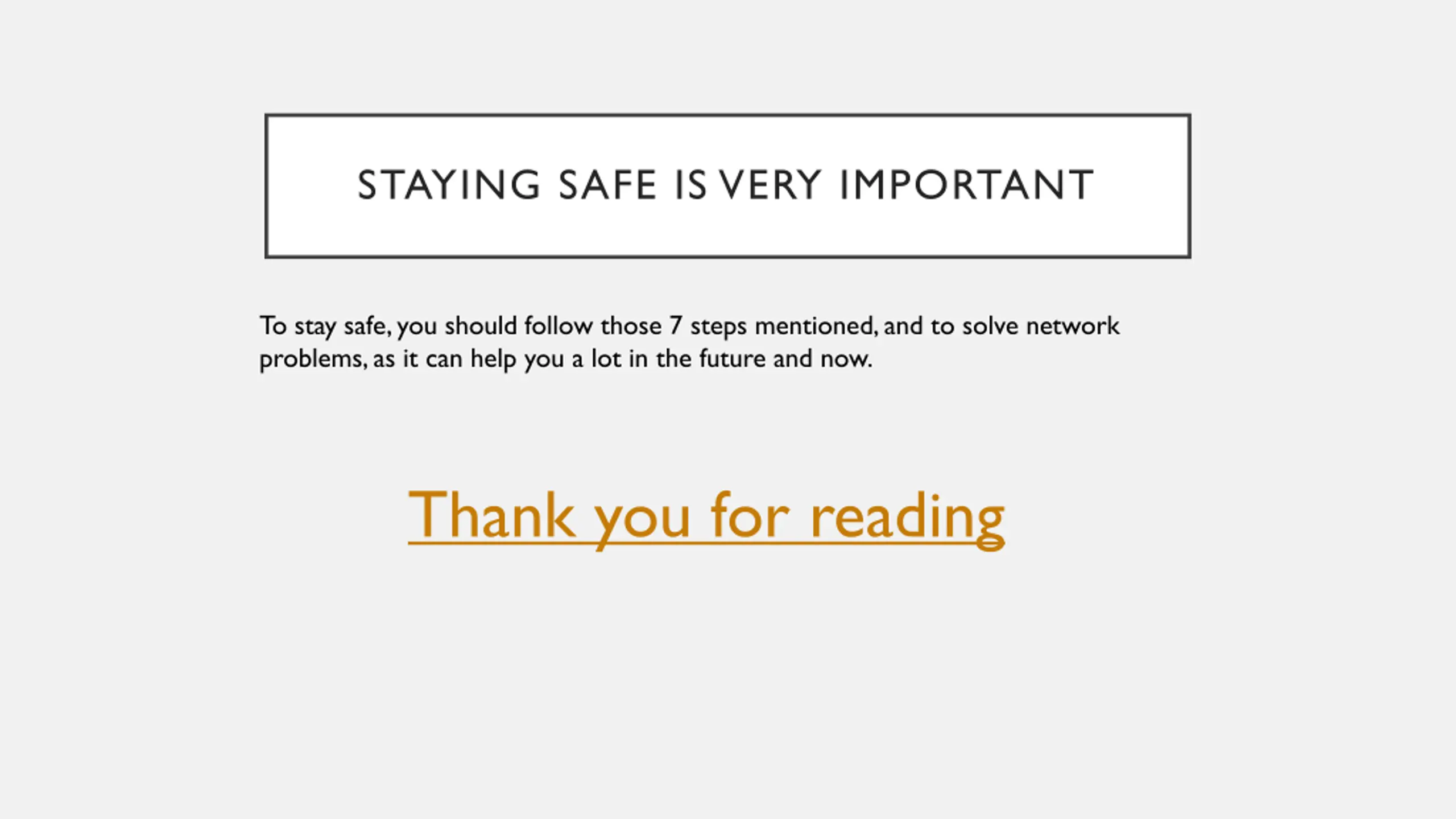 STAYING SAFE IS VERY IMPORTANT To stay safe, you should follow those 7 steps mentioned, and to solve network problems, as it can help you a lot in the future and now. Thank you for reading