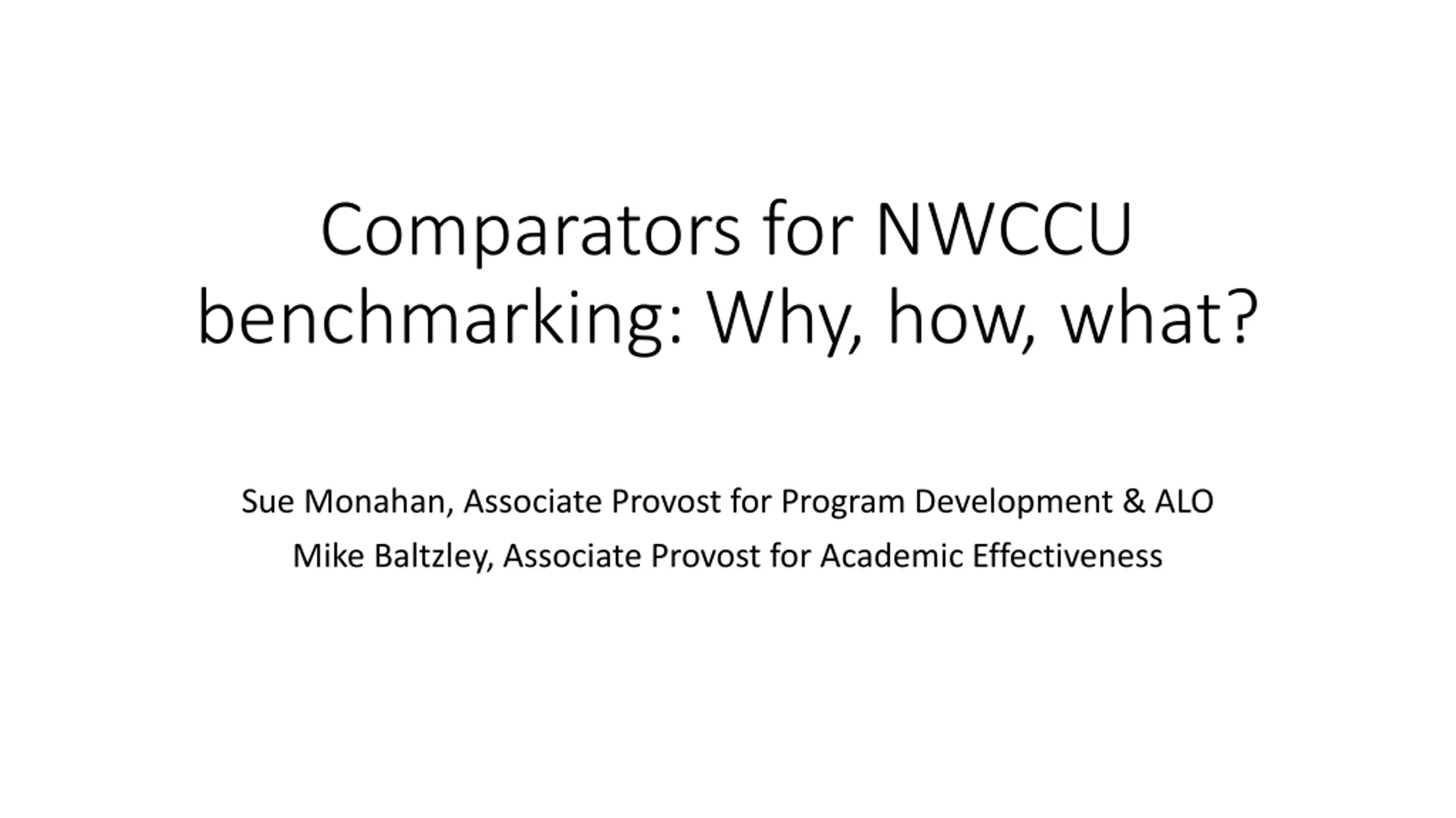 Comparators for NWCCU benchmarking: Why, how, what? Sue Monahan, Associate Provost for Program Development & ALO Mike Baltzley, Associate Provost for Academic Effectiveness