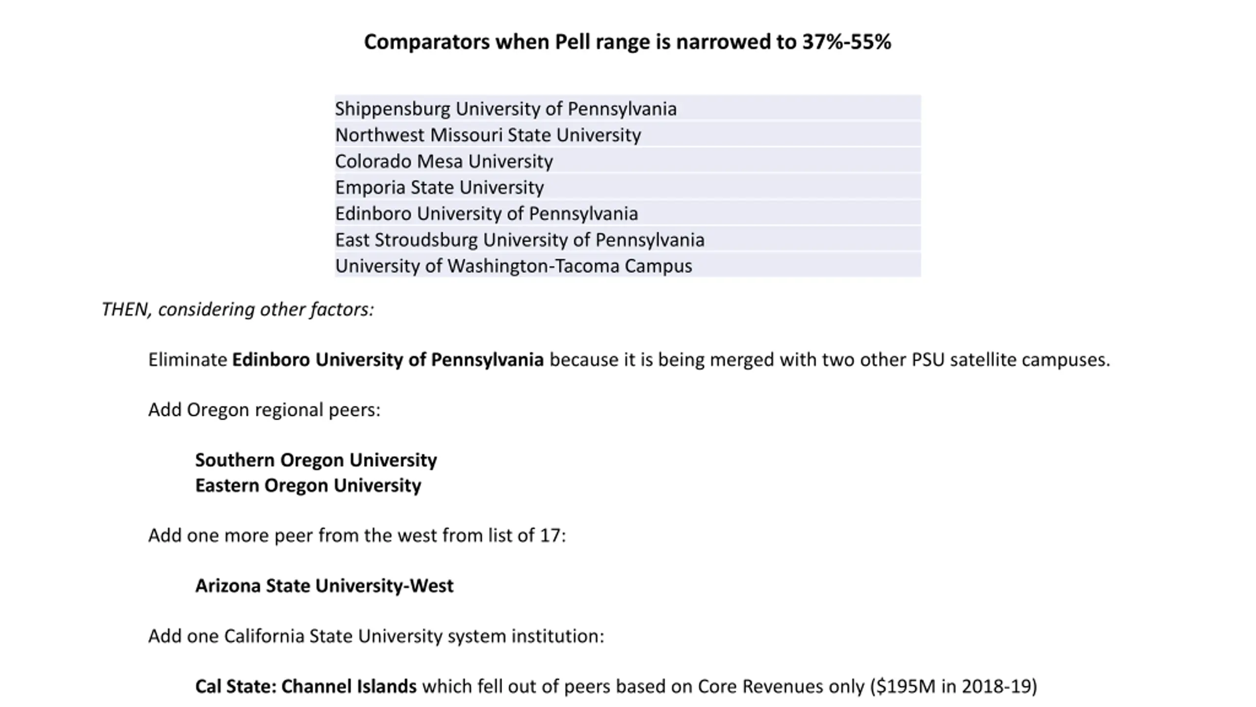 Comparators when Pell range is narrowed to 37%-55% Shippensburg University of Pennsylvania Northwest Missouri State University Colorado Mesa University Emporia State University Edinboro University of Pennsylvania East Stroudsburg University of Pennsylvania University of Washington-Tacoma Campus THEN, considering other factors: Eliminate Edinboro University of Pennsylvania because it is being merged with two other PSU satellite campuses. Add Oregon regional peers: Southern Oregon University Eastern Oregon University Add one more peer from the west from list of 17: Arizona State University-West Add one California State University system institution: Cal State: Channel Islands which fell out of peers based on Core Revenues only ($195M in 2018-19)