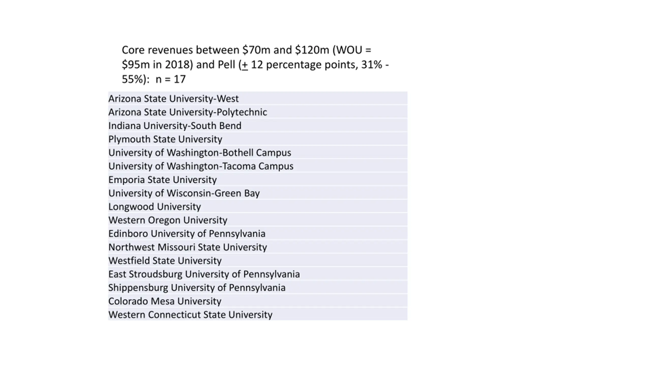 Core revenues between $70m and $120m (WOU = $95m in 2018) and Pell (+ 12 percentage points, 31% - 55%): n = 17 Arizona State University-West Arizona State University-Polytechnic Indiana University-South Bend Plymouth State University University of Washington-Bothell Campus University of Washington-Tacoma Campus Emporia State University University of Wisconsin-Green Bay Longwood University Western Oregon University Edinboro University of Pennsylvania Northwest Missouri State University Westfield State University East Stroudsburg University of Pennsylvania Shippensburg University of Pennsylvania Colorado Mesa University Western Connecticut State University
