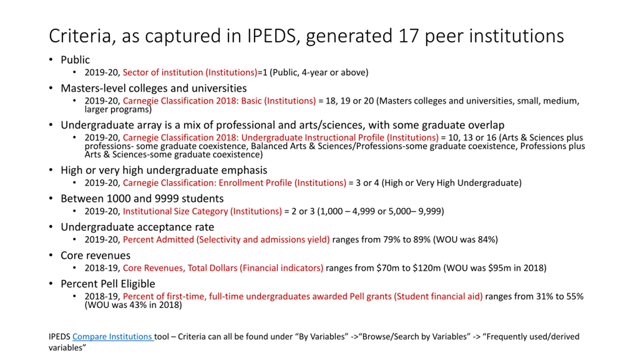 Criteria, as captured in IPEDS, generated 17 peer institutions Public 2019-20, Sector of institution (Institutions)=1 (Public, 4-year or above) Masters-level colleges and universities 2019-20, Carnegie Classification 2018: Basic (Institutions) = 18, 19 or 20 (Masters colleges and universities, small, medium, larger programs) Undergraduate array is a mix of professional and arts/sciences, with some graduate overlap 2019-20, Carnegie Classification 2018: Undergraduate Instructional Profile (Institutions) = 10, 13 or 16 (Arts & Sciences plus professions- some graduate coexistence, Balanced Arts & Sciences/Professions-some graduate coexistence, Professions plus Arts & Sciences-some graduate coexistence) High or very high undergraduate emphasis 2019-20, Carnegie Classification: Enrollment Profile (Institutions) = 3 or 4 (High or Very High Undergraduate) Between 1000 and 9999 students 2019-20, Institutional Size Category (Institutions) = 2 or 3 (1,000 4,999 or 5,000 9,999) Undergraduate acceptance rate 2019-20, Percent Admitted (Selectivity and admissions yield) ranges from 79% to 89% (WOU was 84%) Core revenues 2018-19, Core Revenues, Total Dollars (Financial indicators) ranges from $70m to $120m (WOU was $95m in 2018) Percent Pell Eligible 2018-19, Percent of first-time, full-time undergraduates awarded Pell grants (Student financial aid) ranges from 31% to 55% (WOU was 43% in 2018) IPEDS Compare Institutions tool Criteria can all be found under By Variables -> Browse/Search by Variables -> Frequently used/derived variables