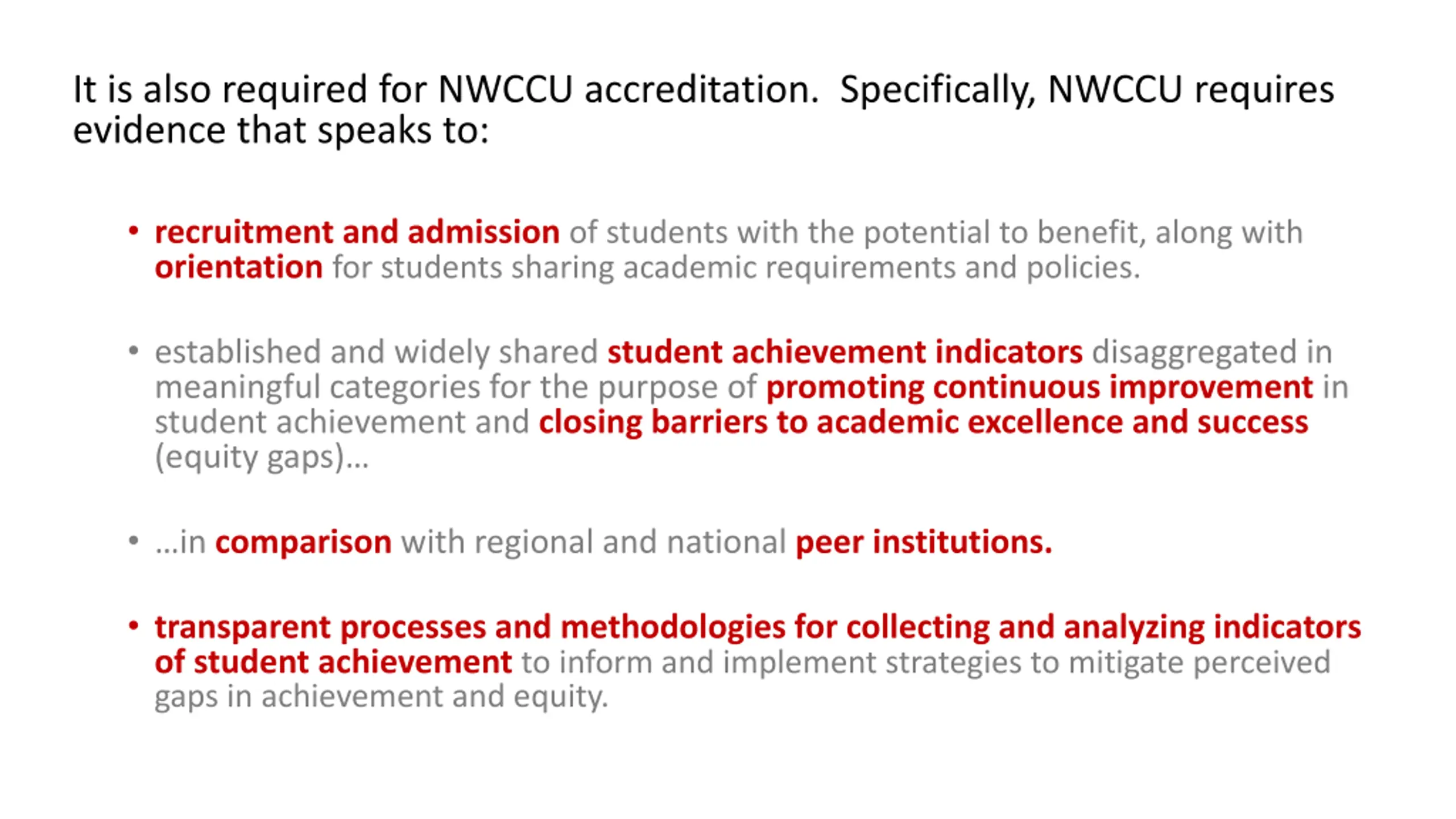 It is also required for NWCCU accreditation. Specifically, NWCCU requires evidence that speaks to: recruitment and admission of students with the potential to benefit, along with orientationfor students sharing academic requirements and policies. established and widely shared student achievement indicators disaggregated in meaningful categories for the purpose of promoting continuous improvement in student achievement and closing barriers to academic excellence and success (equity gaps) in comparison with regional and national peer institutions. transparent processes and methodologies for collecting and analyzing indicators of student achievementto inform and implement strategies to mitigate perceived gaps in achievement and equity.