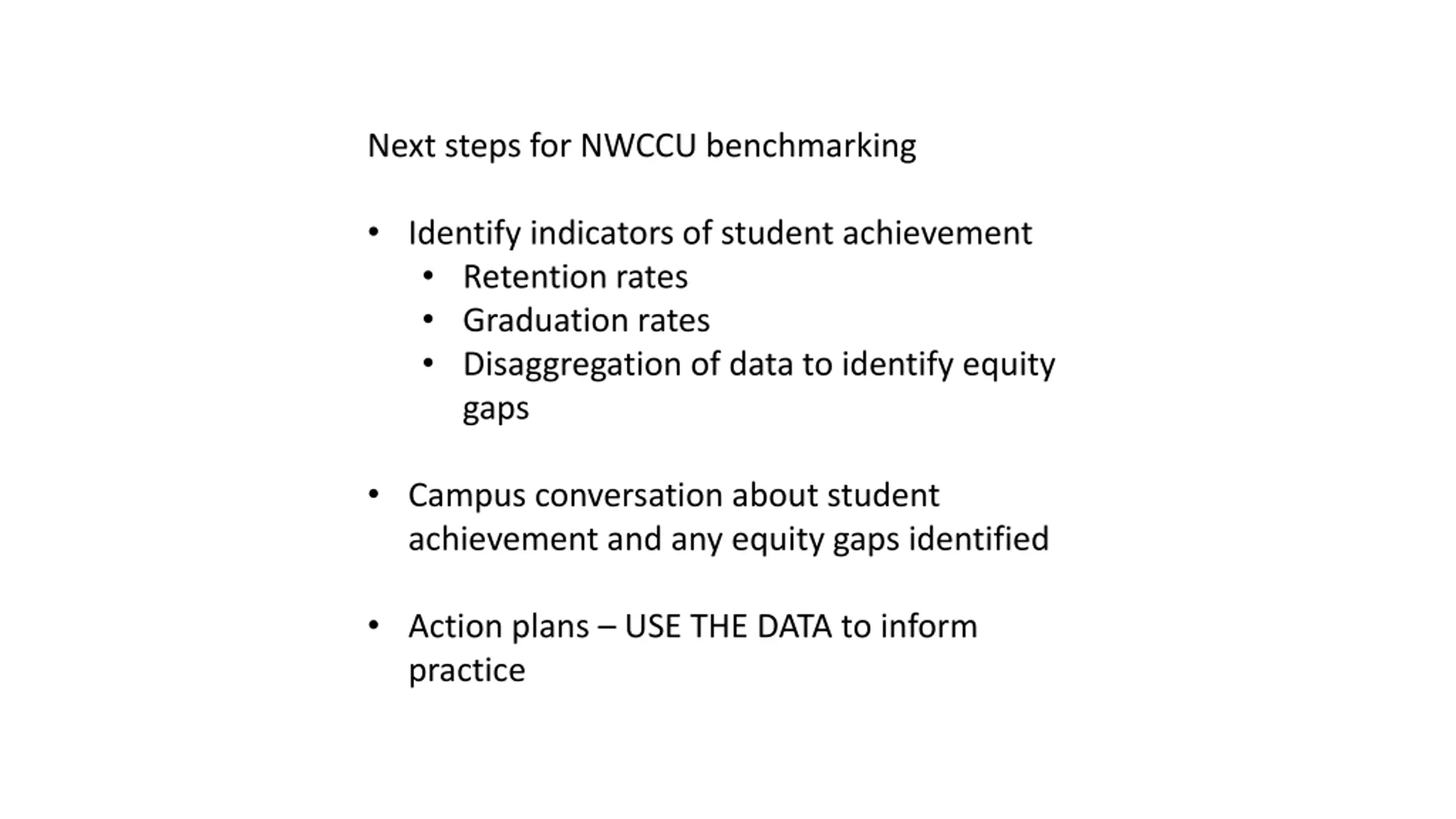 Next steps for NWCCU benchmarking Identify indicators of student achievement Retention rates Graduation rates Disaggregation of data to identify equity gaps Campus conversation about student achievement and any equity gaps identified Action plans USE THE DATA to inform practice