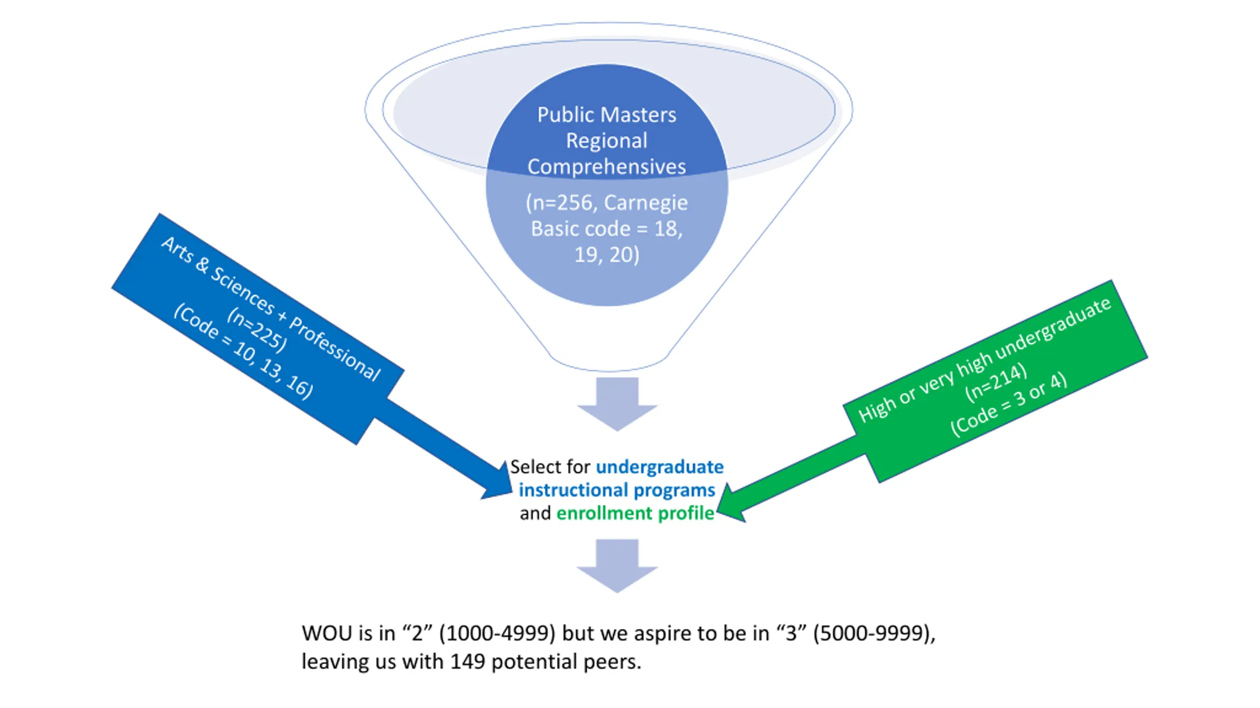 Public Masters Regional Comprehensives (n=256, Carnegie Basic code = 18, 19, 20) Select for undergraduate instructional programs and enrollment profile WOU is in 2 (1000-4999) but we aspire to be in 3 (5000-9999), leaving us with 149 potential peers.