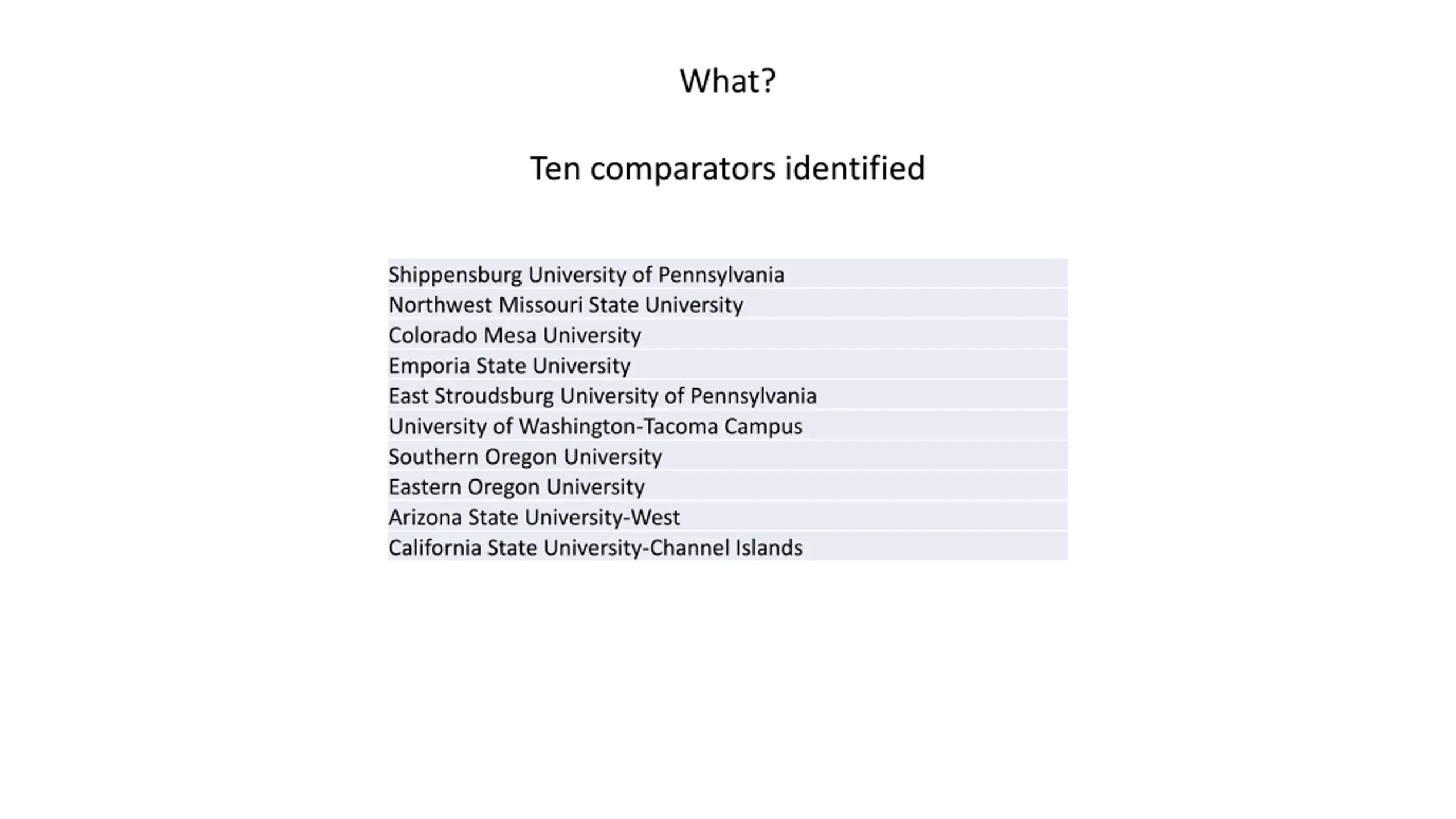 What? Ten comparators identified Shippensburg University of Pennsylvania Northwest Missouri State University Colorado Mesa University Emporia State University East Stroudsburg University of Pennsylvania University of Washington-Tacoma Campus Southern Oregon University Eastern Oregon University Arizona State University-West California State University-Channel Islands