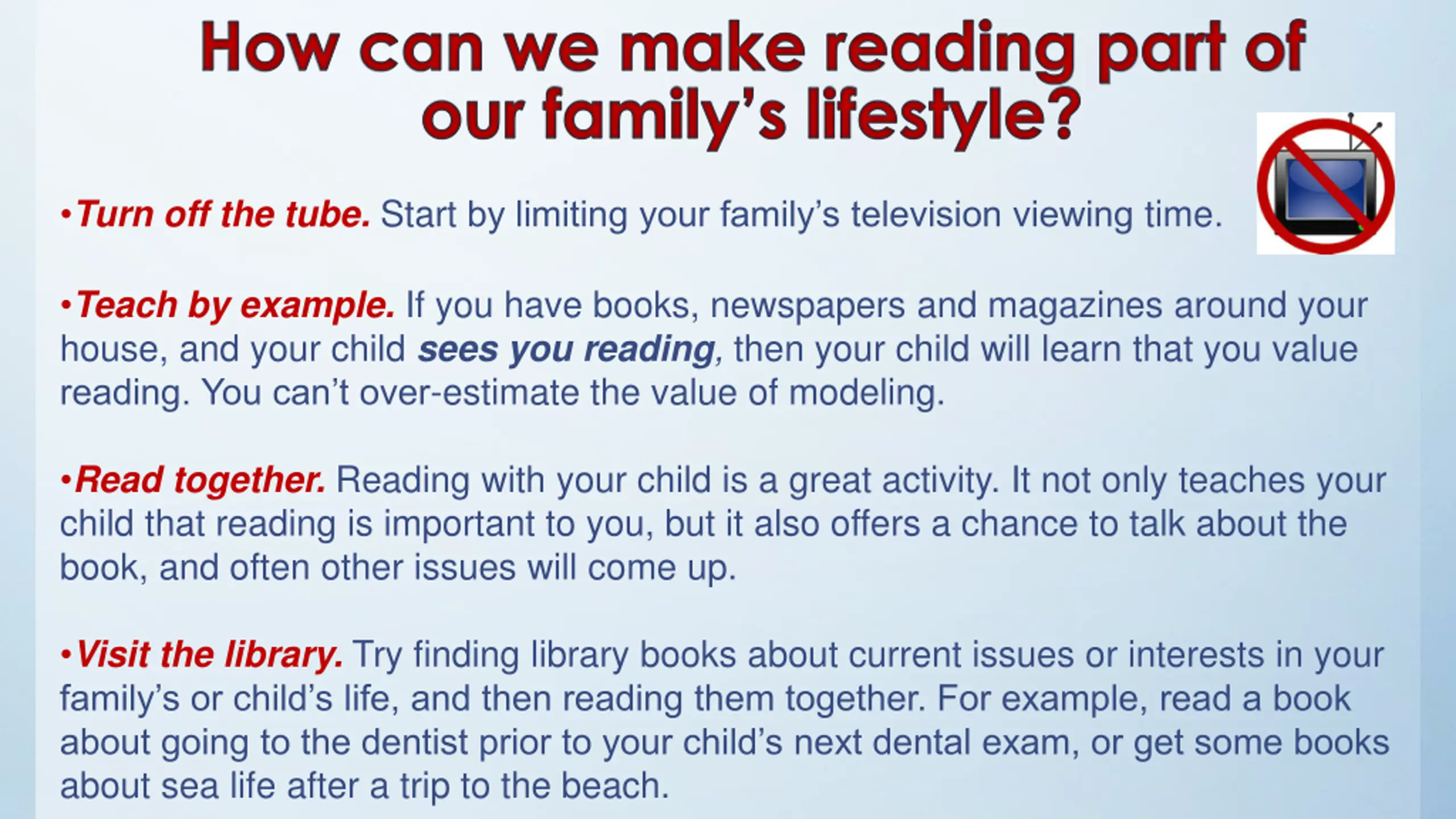 How can we make reading part of our family s lifestyle? Turn off the tube. Start by limiting your family s television viewing time. Teach by example. If you have books, newspapers and magazines around your house, and your child sees you reading, then your child will learn that you value reading. You can t over-estimate the value of modeling. Read together. Reading with your child is a great activity. It not only teaches your child that reading is important to you, but it also offers a chance to talk about the book, and often other issues will come up. Visit the library. Try finding library books about current issues or interests in your family s or child s life, and then reading them together. For example, read a book about going to the dentist prior to your child s next dental exam, or get some books about sea life after a trip to the beach.