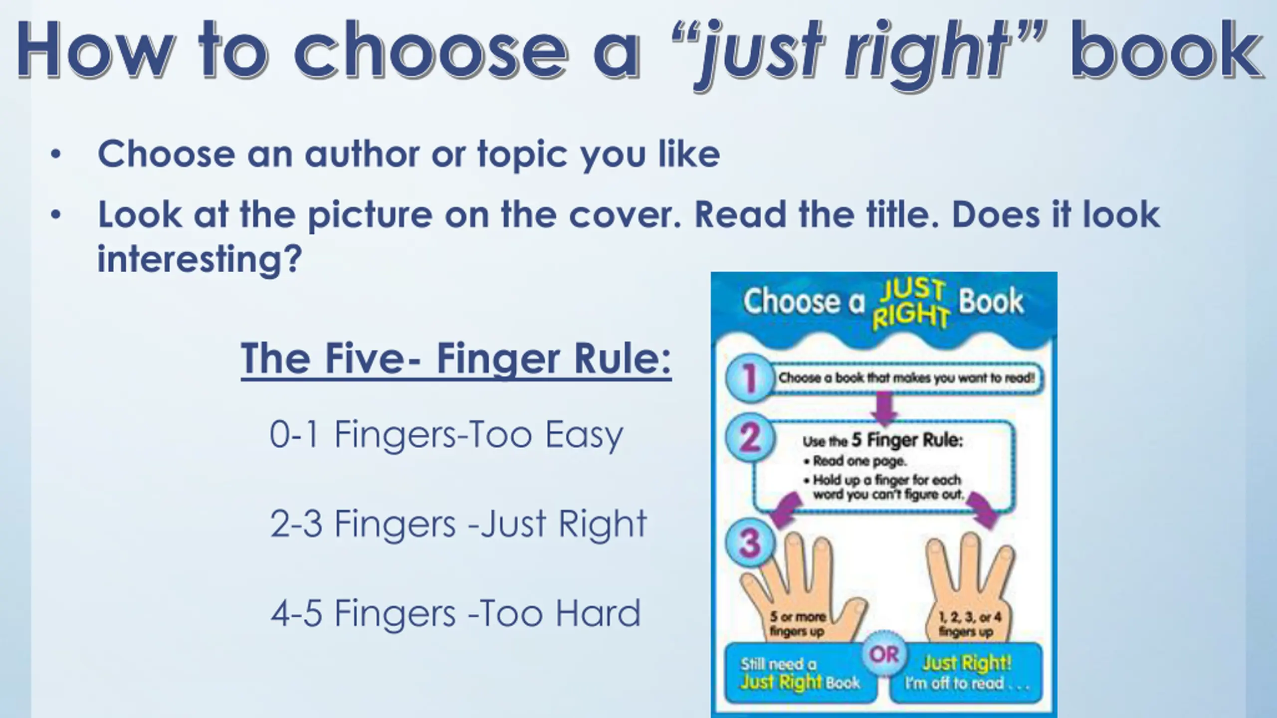 How to choose a just right book Choose an author or topic you like Look at the picture on the cover. Read the title. Does it look interesting? The Five- Finger Rule: 0 1 Fingers-Too Easy 2-3 Fingers -Just Right 4-5 Fingers -Too Hard