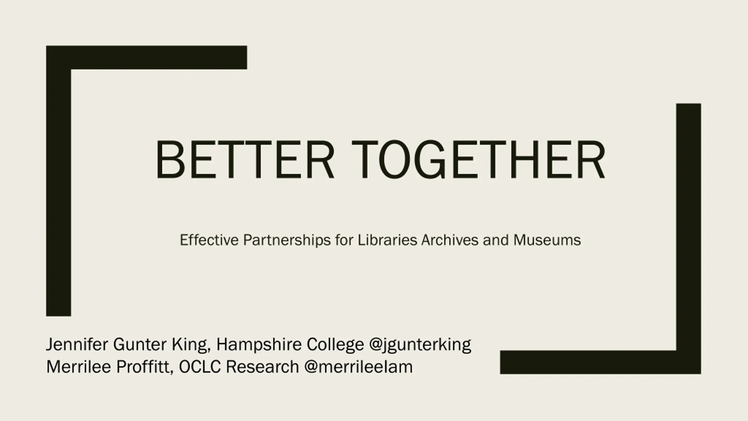 BETTER TOGETHER Effective Partnerships for Libraries Archives and Museums Jennifer Gunter King, Hampshire College @jgunterking Merrilee Proffitt, OCLC Research @merrileeIam