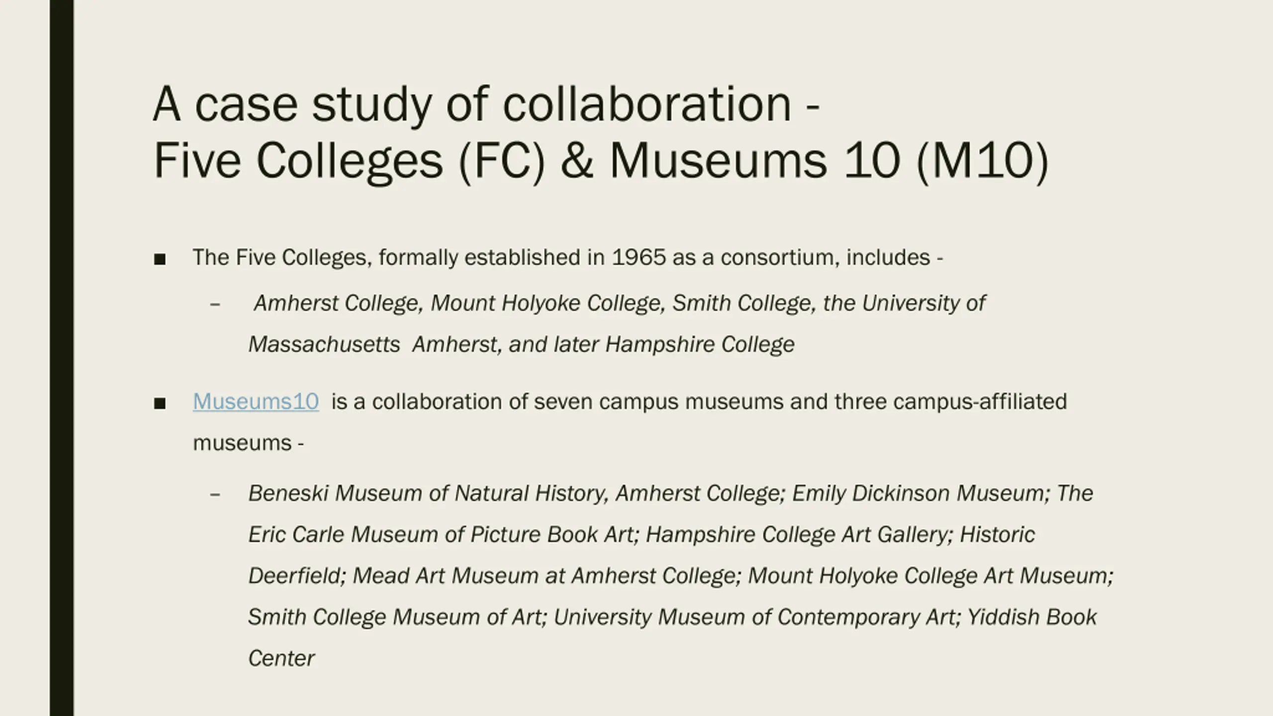 A case study of collaboration - Five Colleges (FC) & Museums 10 (M10) The Five Colleges, formally established in 1965 as a consortium, includes - Amherst College, Mount Holyoke College, Smith College, the University of Massachusetts Amherst, and later Hampshire College Museums10 is a collaboration of seven campus museums and three campus-affiliated museums - Beneski Museum of Natural History, Amherst College; Emily Dickinson Museum; The Eric Carle Museum of Picture Book Art; Hampshire College Art Gallery; Historic Deerfield; Mead Art Museum at Amherst College; Mount Holyoke College Art Museum; Smith College Museum of Art; University Museum of Contemporary Art; Yiddish Book Center