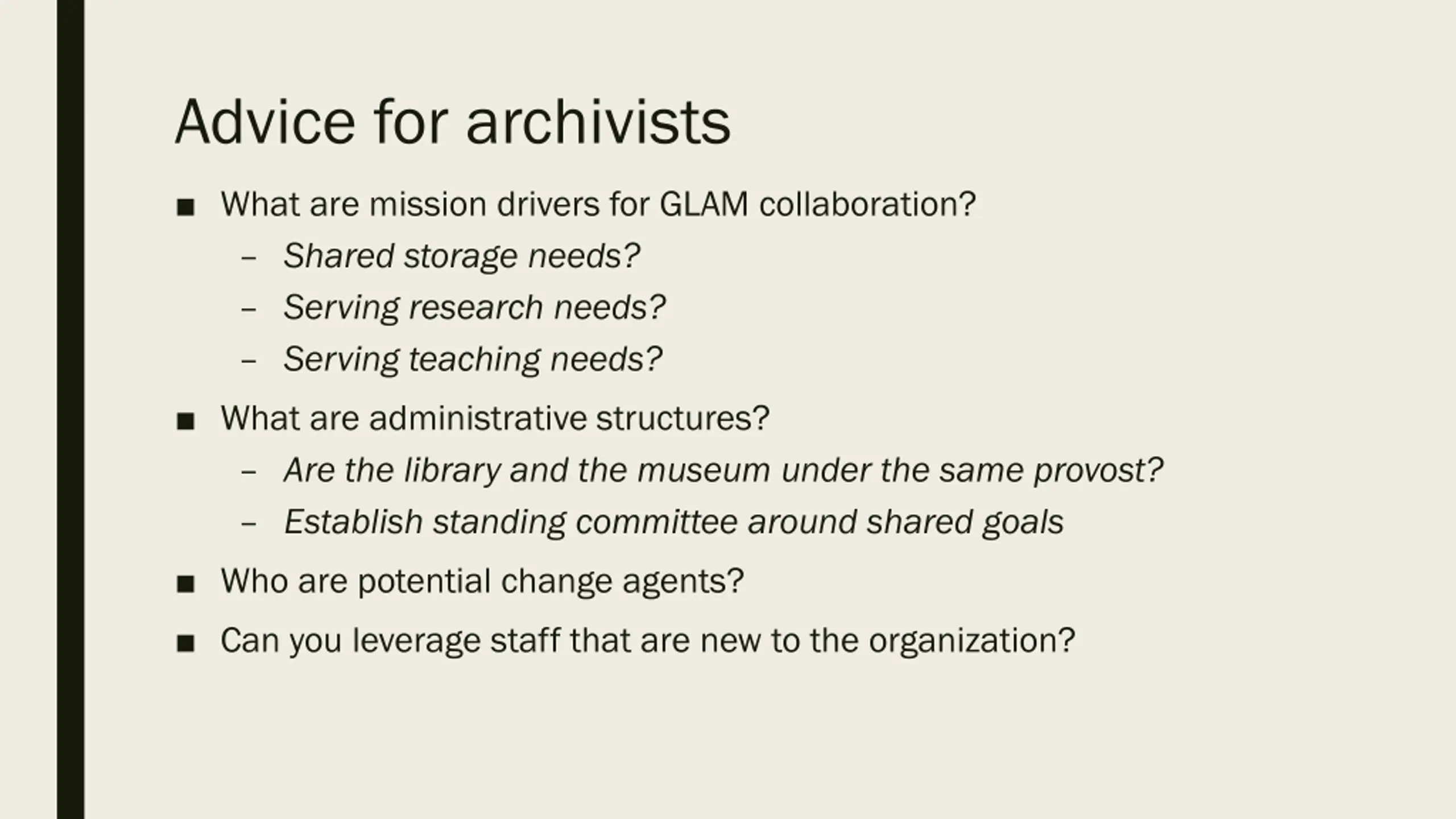 Advice for archivists What are mission drivers for GLAM collaboration? Shared storage needs? Serving research needs? Serving teaching needs? What are administrative structures? Are the library and the museum under the same provost? Establish standing committee around shared goals Who are potential change agents? Can you leverage staff that are new to the organization?