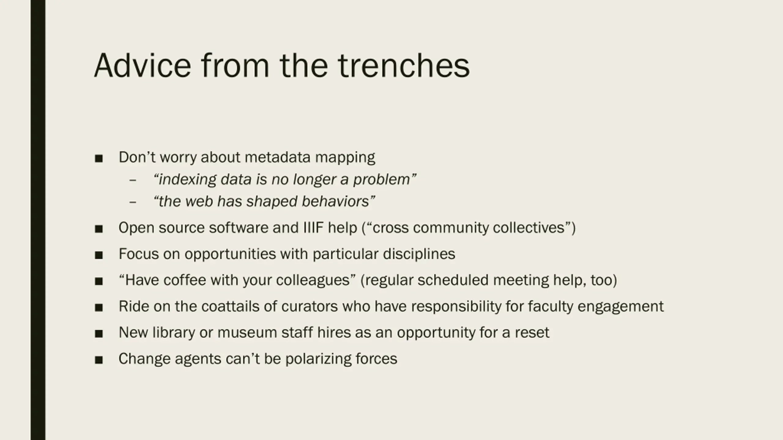 Advice from the trenches Don t worry about metadata mapping indexing data is no longer a problem the web has shaped behaviors Open source software and IIIF help ( cross community collectives ) Focus on opportunities with particular disciplines Have coffee with your colleagues (regular scheduled meeting help, too) Ride on the coattails of curators who have responsibility for faculty engagement New library or museum staff hires as an opportunity for a reset Change agents can t be polarizing forces