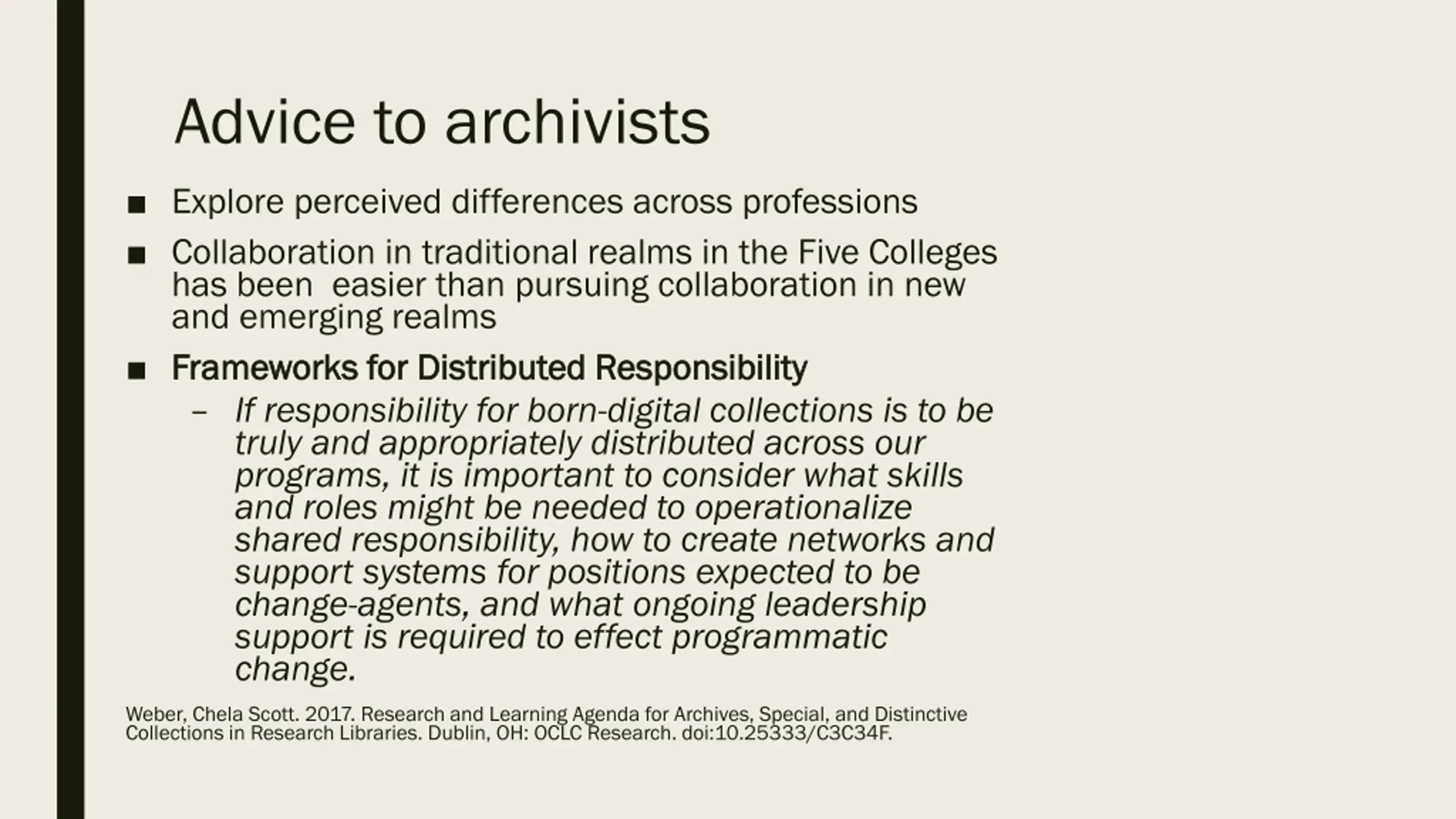 Advice to archivists Explore perceived differences across professions Collaboration in traditional realms in the Five Colleges has been easier than pursuing collaboration in new and emerging realms Frameworks for Distributed Responsibility Frameworks for Distributed Responsibility If responsibility for born-digital collections is to be truly and appropriately distributed across our programs, it is important to consider what skills and roles might be needed to operationalize shared responsibility, how to create networks and support systems for positions expected to be change-agents, and what ongoing leadership support is required to effect programmatic change. Weber, Chela Scott. 2017. Research and Learning Agenda for Archives, Special, and Distinctive Collections in Research Libraries. Dublin, OH: OCLC Research. doi:10.25333/C3C34F.