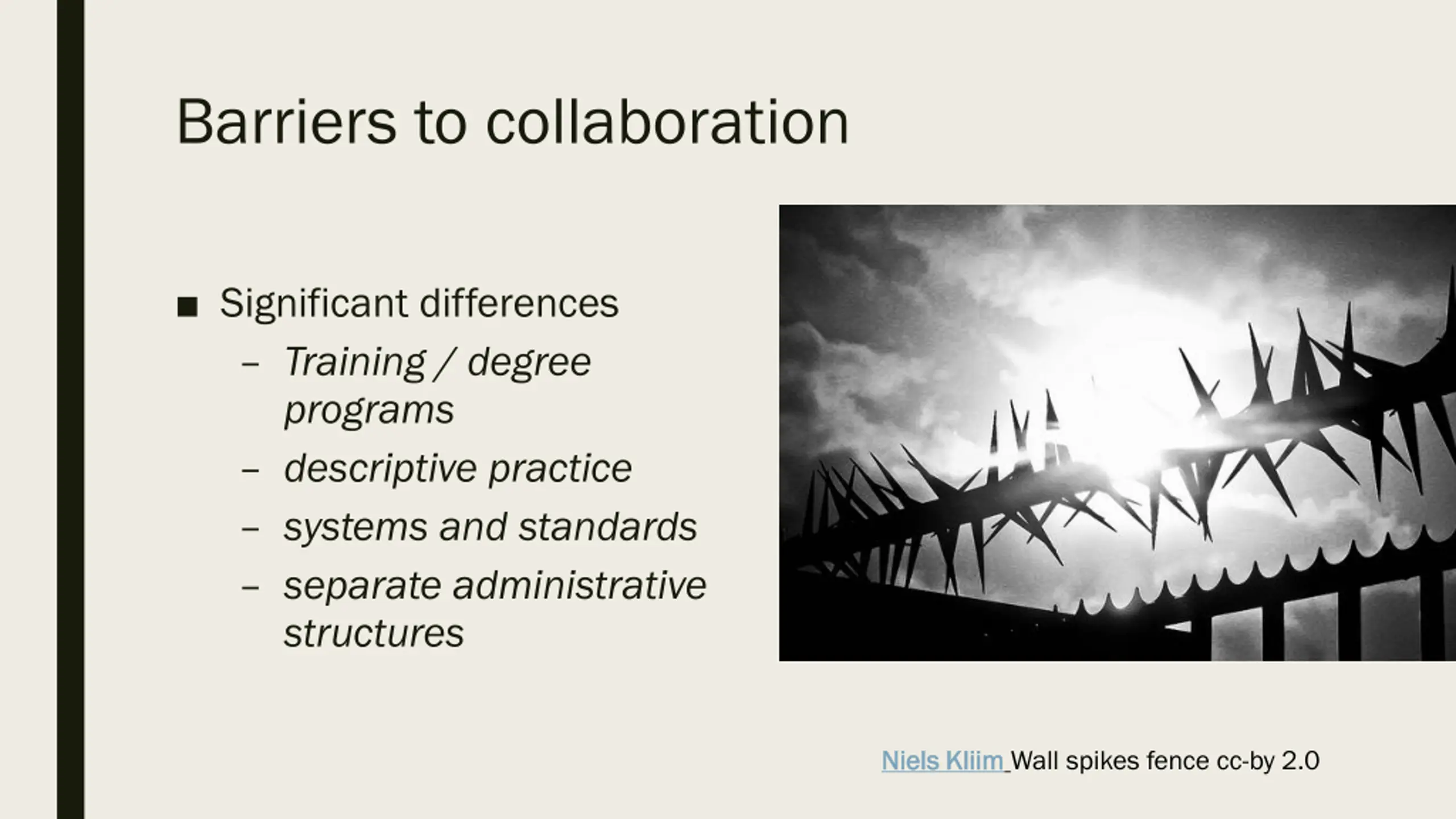 Barriers to collaboration Significant differences Training / degree programs descriptive practice systems and standards separate administrative structures Niels Kliim Niels Kliim Wall spikes fence cc-by 2.0