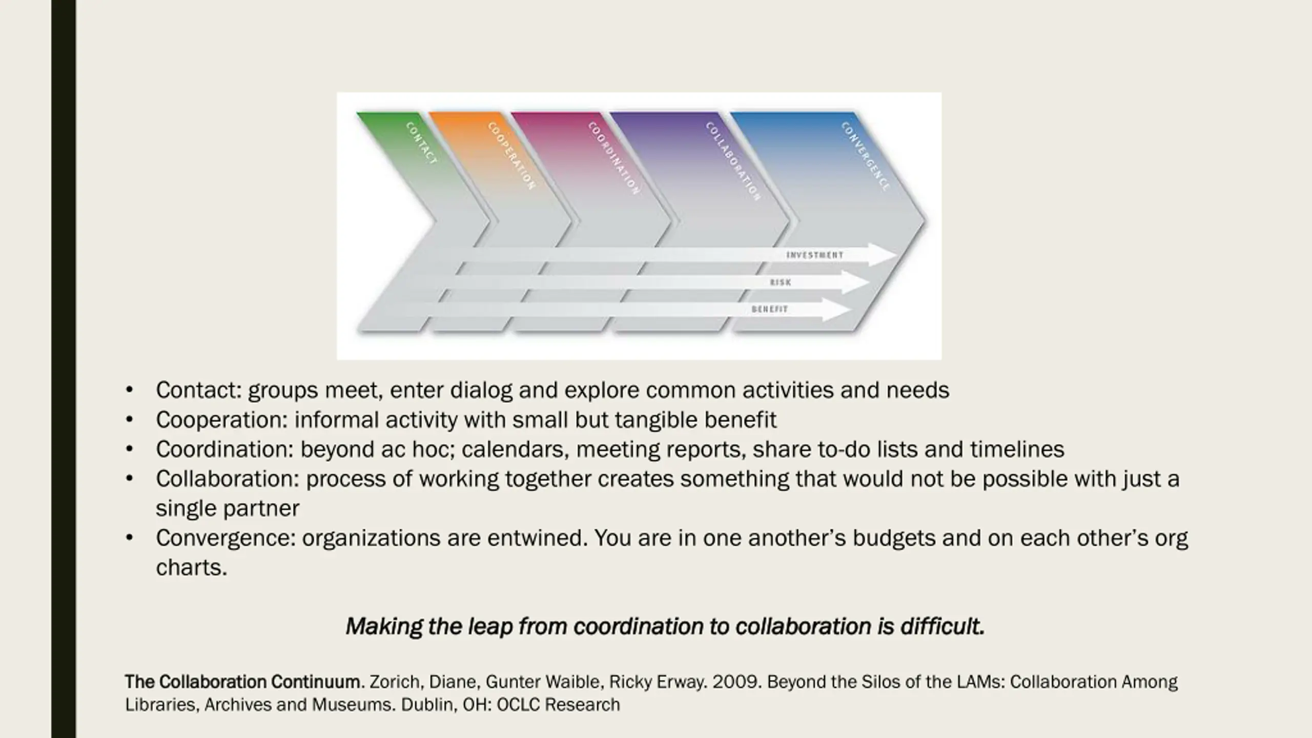 Contact: groups meet, enter dialog and explore common activities and needs Cooperation: informal activity with small but tangible benefit Coordination: beyond ac hoc; calendars, meeting reports, share to-do lists and timelines Collaboration: process of working together creates something that would not be possible with just a single partner Convergence: organizations are entwined. You are in one another s budgets and on each other s org charts. Making the leap from coordination to collaboration is difficult. Making the leap from coordination to collaboration is difficult. The Collaboration Continuum The Collaboration Continuum. Zorich, Diane, Gunter Waible, Ricky Erway. 2009. Beyond the Silos of the LAMs: Collaboration Among Libraries, Archives and Museums. Dublin, OH: OCLC Research