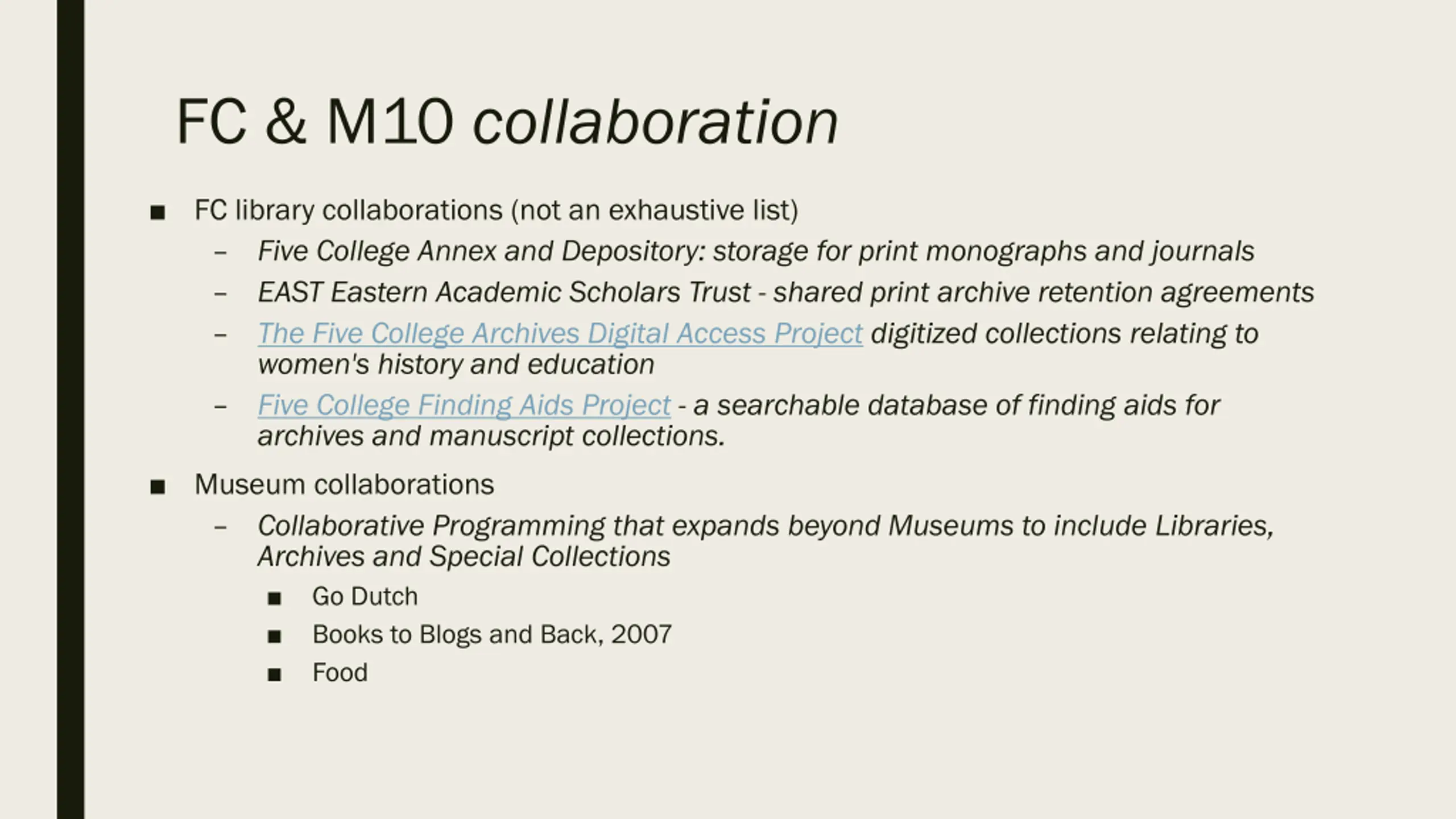 FC & M10 collaboration FC library collaborations (not an exhaustive list) Five College Annex and Depository: storage for print monographs and journals EAST Eastern Academic Scholars Trust - shared print archive retention agreements The Five College Archives Digital Access Project digitized collections relating to women's history and education Five College Finding Aids Project - a searchable database of finding aids for archives and manuscript collections. Museum collaborations Collaborative Programming that expands beyond Museums to include Libraries, Archives and Special Collections Go Dutch Books to Blogs and Back, 2007 Food