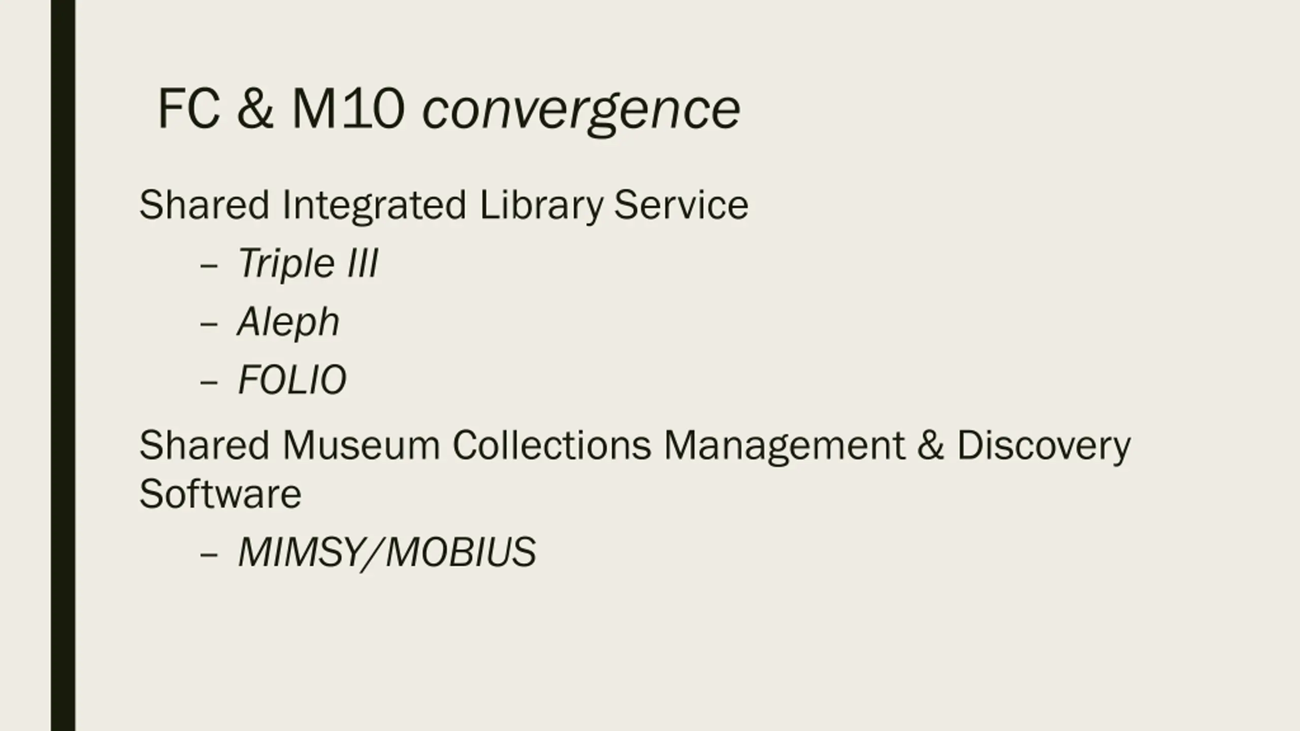 FC & M10 convergence Shared Integrated Library Service Triple III Aleph FOLIO Shared Museum Collections Management & Discovery Software MIMSY/MOBIUS