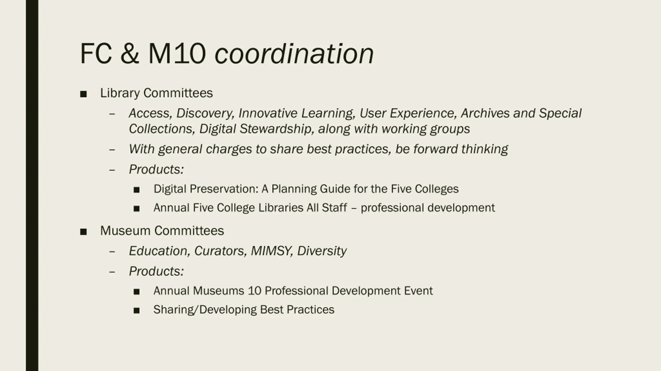 FC & M10 coordination Library Committees Access, Discovery, Innovative Learning, User Experience, Archives and Special Collections, Digital Stewardship, along with working groups With general charges to share best practices, be forward thinking Products: Digital Preservation: A Planning Guide for the Five Colleges Annual Five College Libraries All Staff professional development Museum Committees Education, Curators, MIMSY, Diversity Products: Annual Museums 10 Professional Development Event Sharing/Developing Best Practices