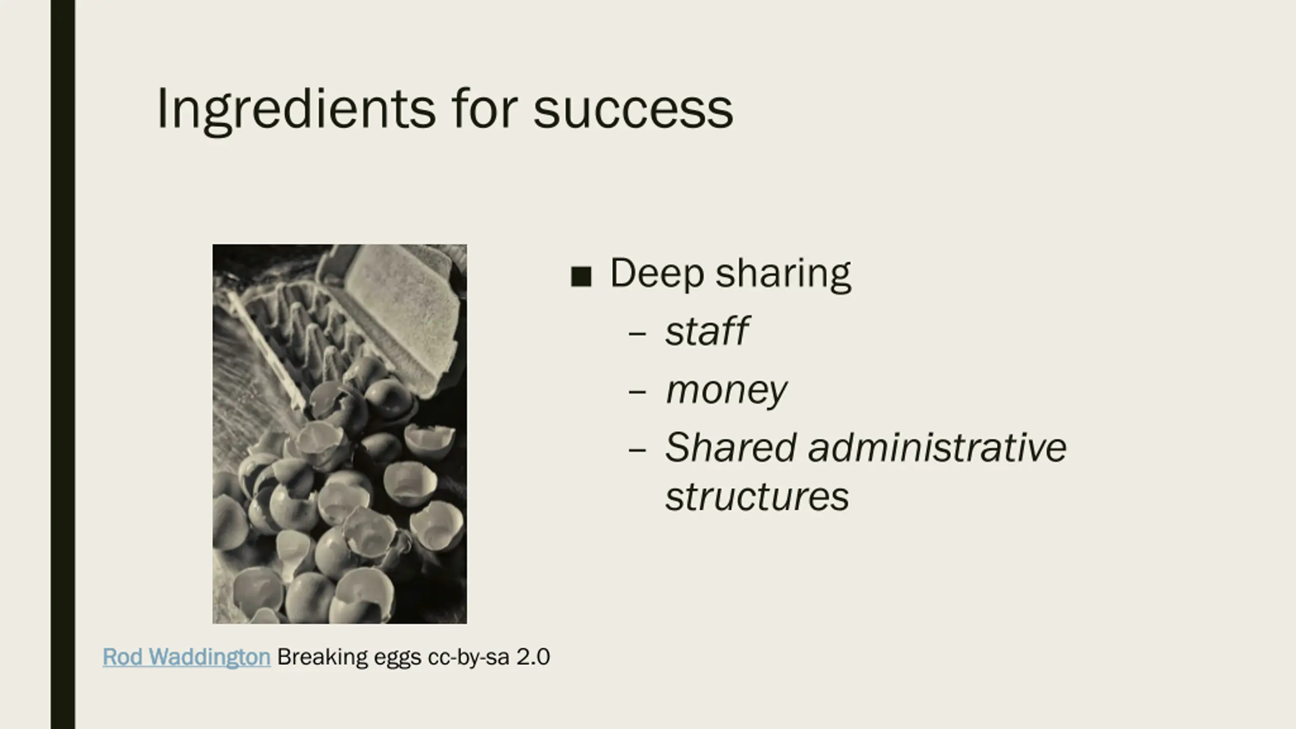 Ingredients for success Deep sharing staff money Shared administrative structures Rod Waddington Rod Waddington Breaking eggs cc-by-sa 2.0
