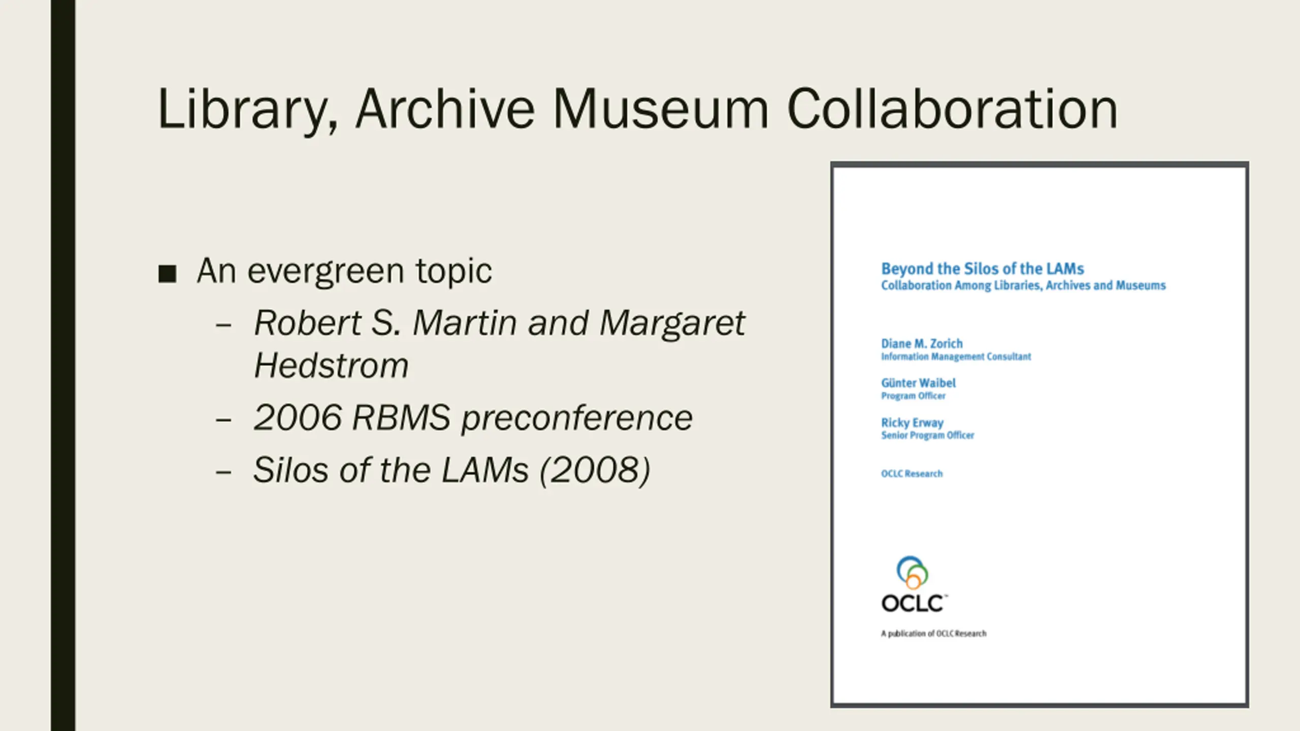 Library, Archive Museum Collaboration An evergreen topic Robert S. Martin and Margaret Hedstrom 2006 RBMS preconference Silos of the LAMs (2008)
