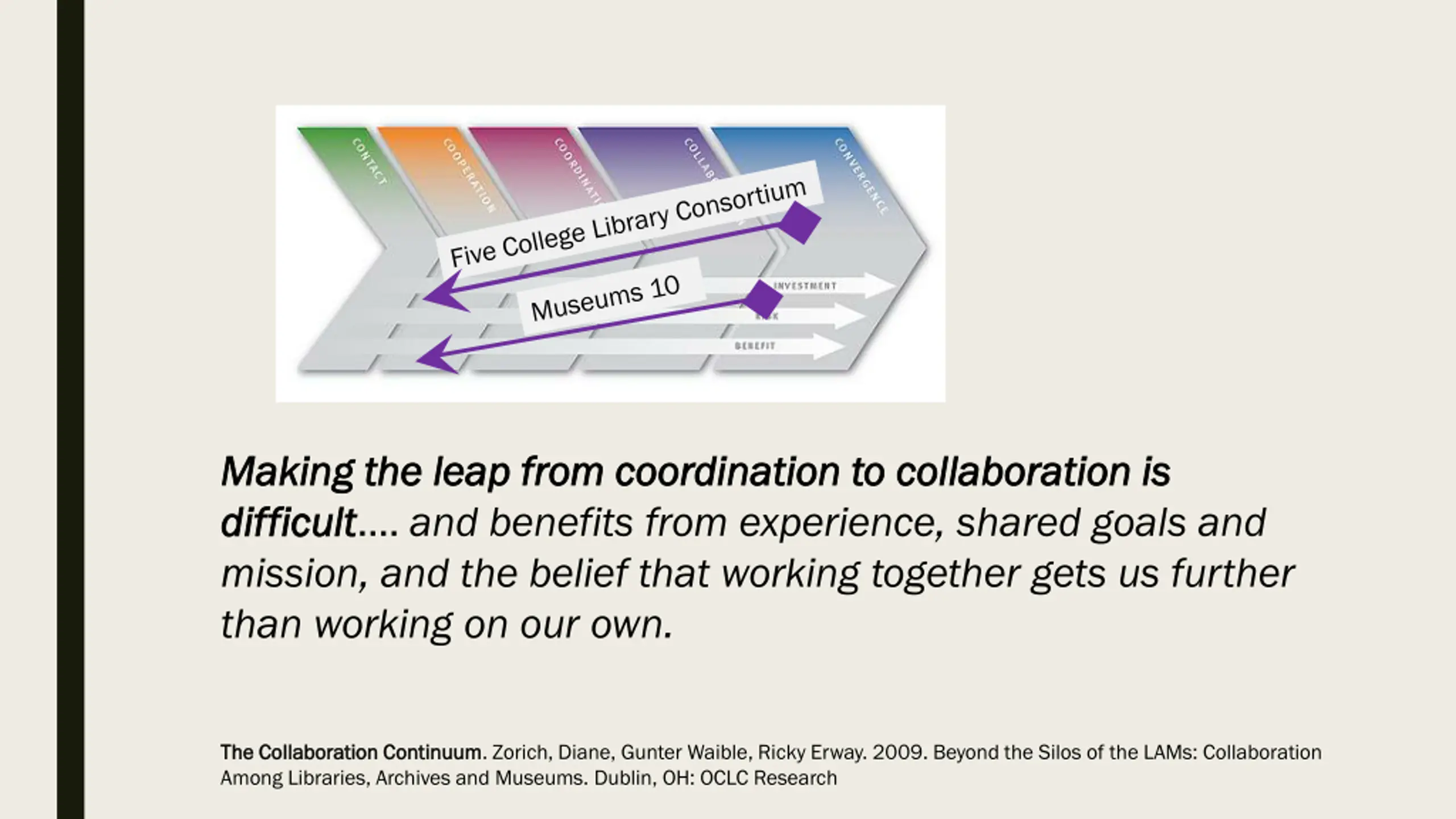 Making the leap from coordination to collaboration is Making the leap from coordination to collaboration is difficult difficult . and benefits from experience, shared goals and mission, and the belief that working together gets us further than working on our own. The Collaboration Continuum The Collaboration Continuum. Zorich, Diane, Gunter Waible, Ricky Erway. 2009. Beyond the Silos of the LAMs: Collaboration Among Libraries, Archives and Museums. Dublin, OH: OCLC Research
